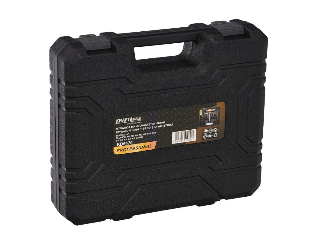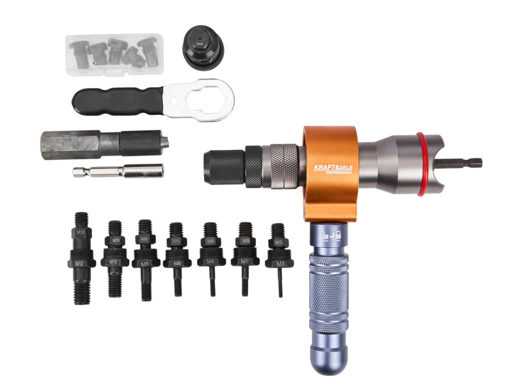 Profesionální nýtovačka na aku šroubovák 3v1 značky Kraft&Dele, model KD5470, s adaptérem na nýtové matice a nýty je inovativní nástroj navržený pro rychlé a pevné spojování prvků v široké škále použití.