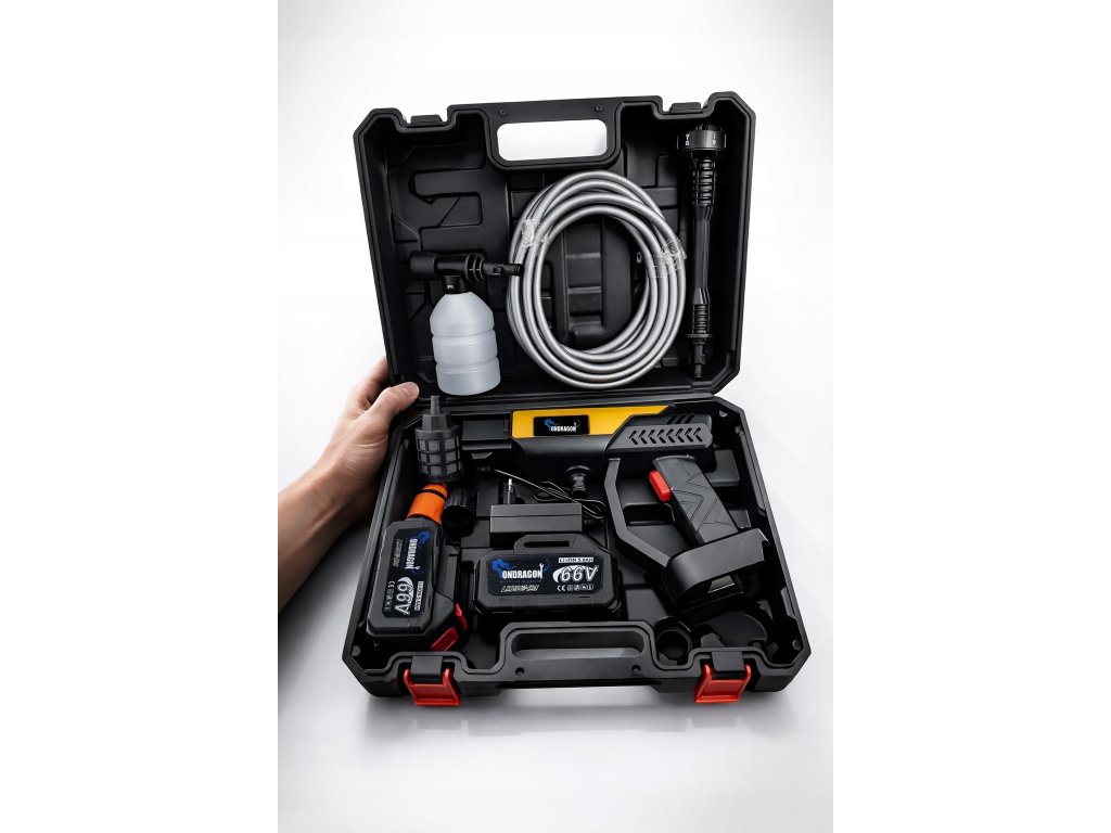 Bezdrátová síla pro každodenní čištění – akumulátorová tlaková myčka Ondragon 66V je vybavena výkonným bezkartáčovým motorem, který generuje tlak až 80 barů a umožňuje efektivní mytí vozidel, teras, fasád, oken i zahradního nábytku. Díky dvěma akumulátorům 66V s kapacitou 5Ah je zařízení připraveno na nepřetržitý provoz až 60 minut. Otočná multi-tryska s 6 režimy, ergonomický design a jednoduché ovládání z ní dělají ideální nástroj pro každého uživatele – bez nutnosti připojení k elektrické síti nebo vodovodu.
