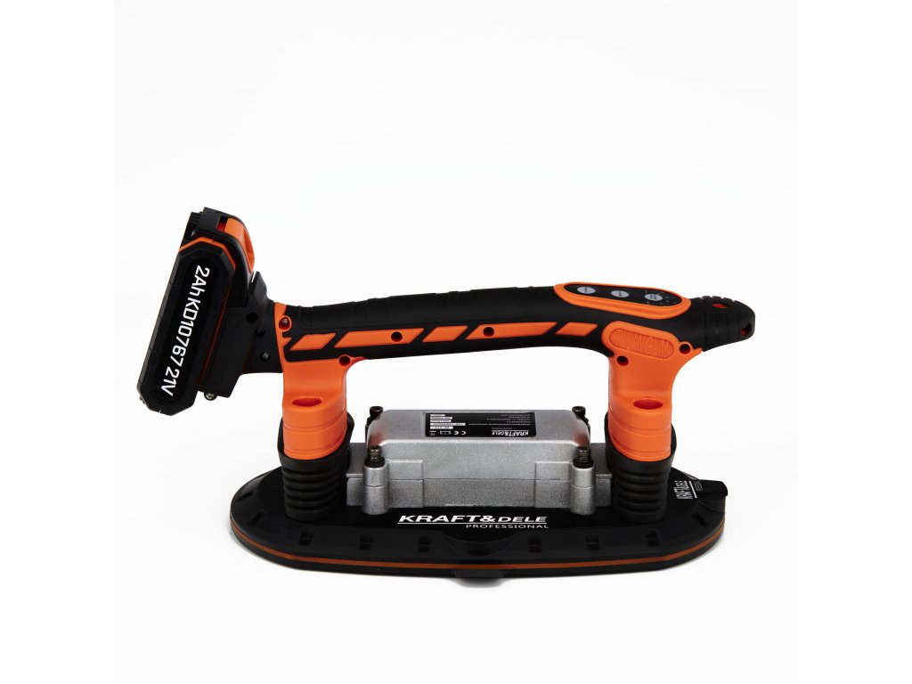 Bezdrátová vibrační přísavka na pokládání dlaždic značky Kraft&Dele, model KD10767. Umožňuje snadné umístění dlaždic pomocí přísavky s možností zvednutí předmětů o hmotnosti až 150 kg. Díky vibrační funkci odstraňuje zbytkové vzduchové bubliny, které by mohly vést k možným prasklinám, a zajišťuje tak pevné a trvanlivé spojení dlaždice s podkladem.