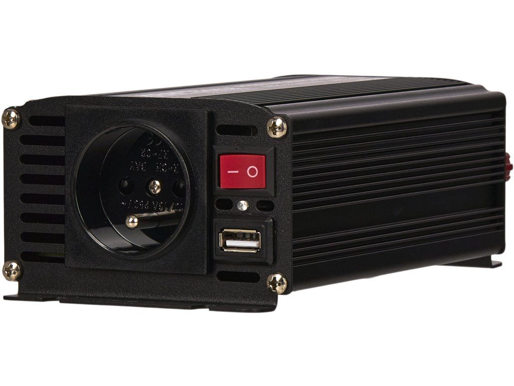 Převodník z 12V DC na 230V AC umožňuje připojení elektrických zařízení k napájení z autobaterie. Speciálně navržený obvod umožňuje výrobu proudu s trvalým výkonem 350W a špičkovým (impulsním) výkonem až 700W. Zařízení je vybaveno funkcí vypnutí při příliš vysokém nebo nízkém vstupním napětí, ochranou před přehřátím, přetížením i pojistkou proti zkratu.