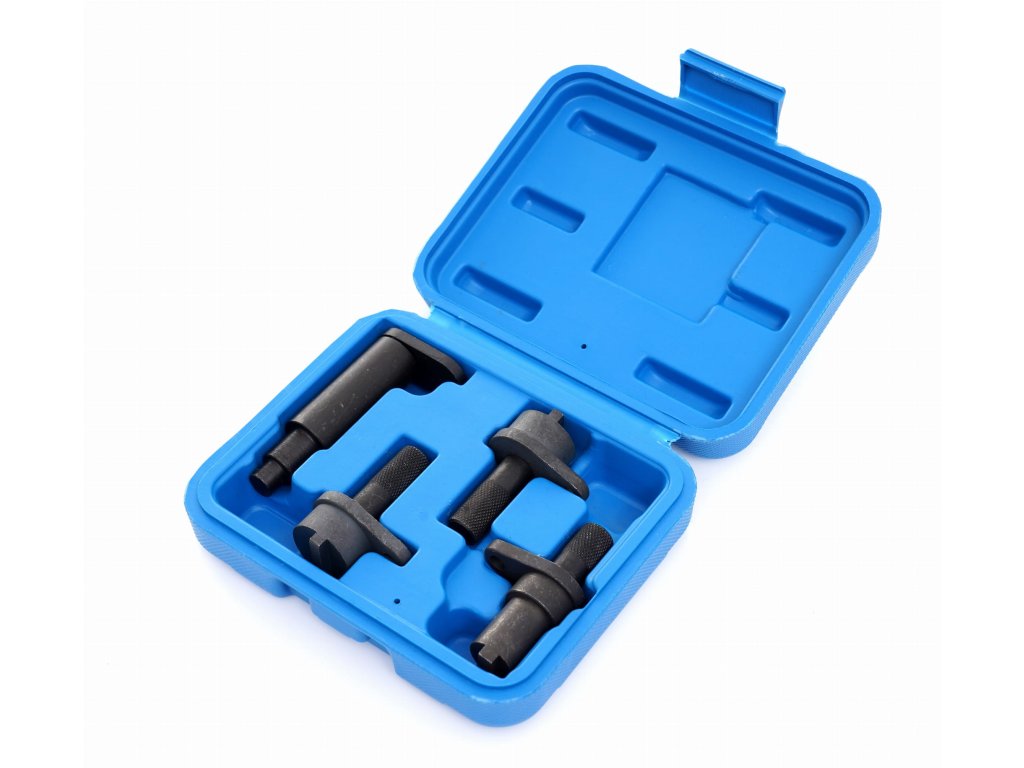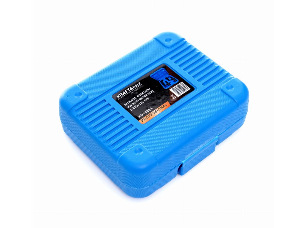Profesionální sada pro servis rozvodů značky Kraft&Dele, model KD10094, určená pro servis a nastavení rozvodů v benzínových motorech skupiny VAG - 1,2l s jedním vačkovým hřídelem 6V a dvouvačkovým hřídelem 12V - 3 válcové motory. Blokáda rozvodů je proces, který umožňuje kontrolu pohybu ventilů, což ovlivňuje efektivitu spalování paliva a výkon motoru.