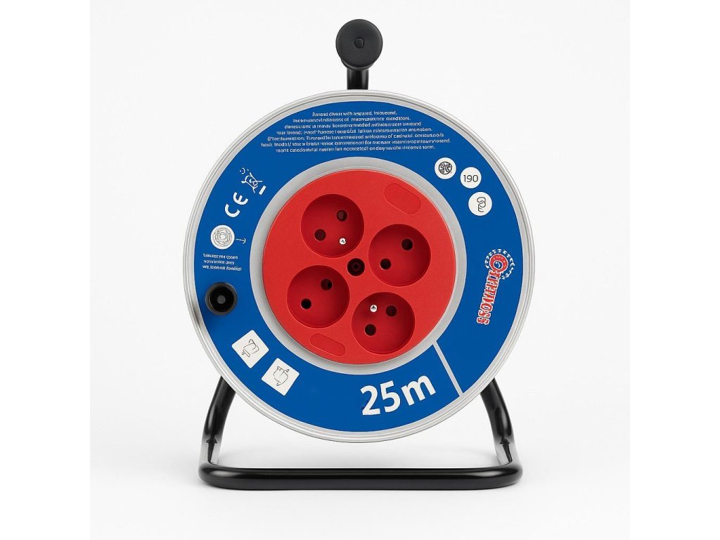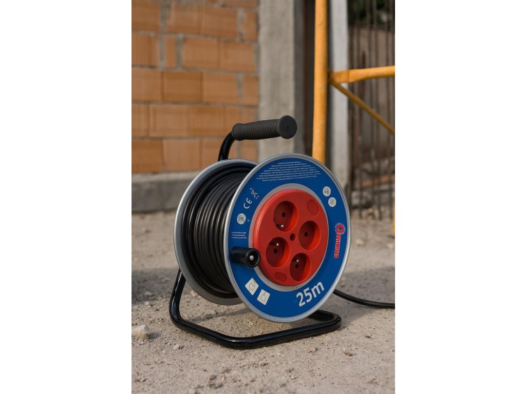 Spolehlivý pomocník pro stavbu, zahradu i dílnu. Tento robustní bubnový prodlužovací kabel o délce 25 metrů a průřezu 3 × 2,5 mm² je ideální volbou pro každého, kdo potřebuje bezpečné a výkonné napájení na delší vzdálenosti. Díky pevné kovové konstrukci a bubnu, čtyřem zásuvkám s krytím IP44 a integrované tepelné pojistce zvládne náročné podmínky na stavbách i v domácím prostředí. Snadné navíjení zajišťuje odolný buben a ergonomická rukojeť s protiskluzovým madlem.