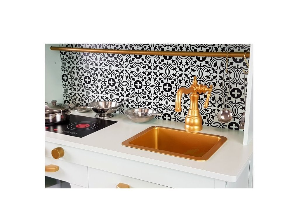 Dětská kuchyňka je zbarvená do mátově zelené se zlatými prvky. Na pracovní ploše se nachází umyvadlo a indukční deska. Nad umyvadlem jsou tři skříňky a v jedná skříňce jsou otevíratelné dvířka se sklem. Dolní části se nachází dvě skříňky s otevíracími dvířky. Mezi horními a dolními skříňkami je krásný černobílý vzor.