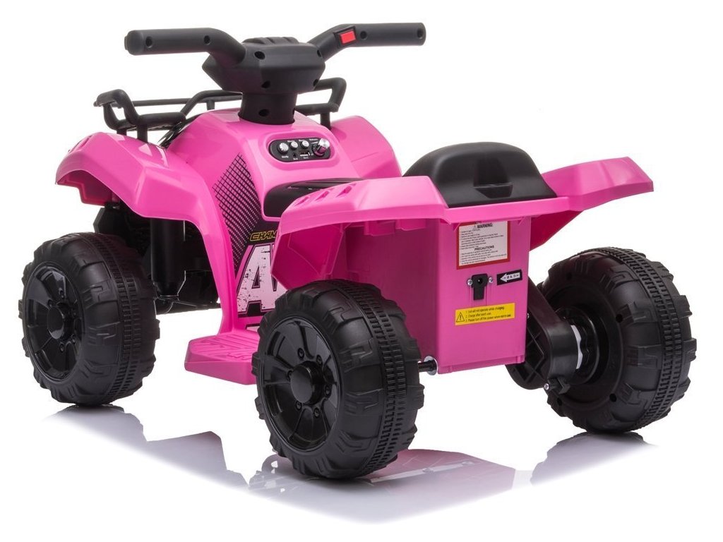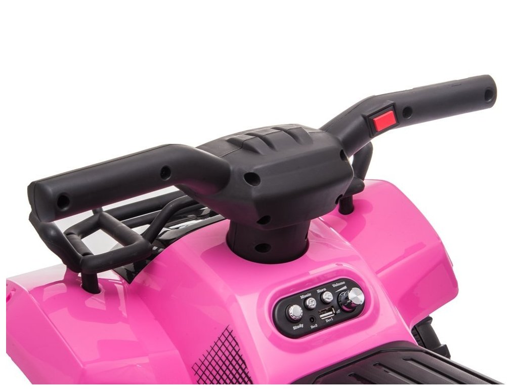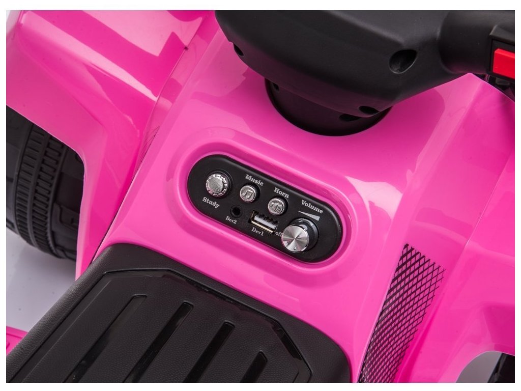 Elektrická čtyřkolka je vybavena pohodlně tvarovaným sedadlem, koly s gumovým lemem, předními LED světly a hudebním panelem se vstupy MP3 a USB.