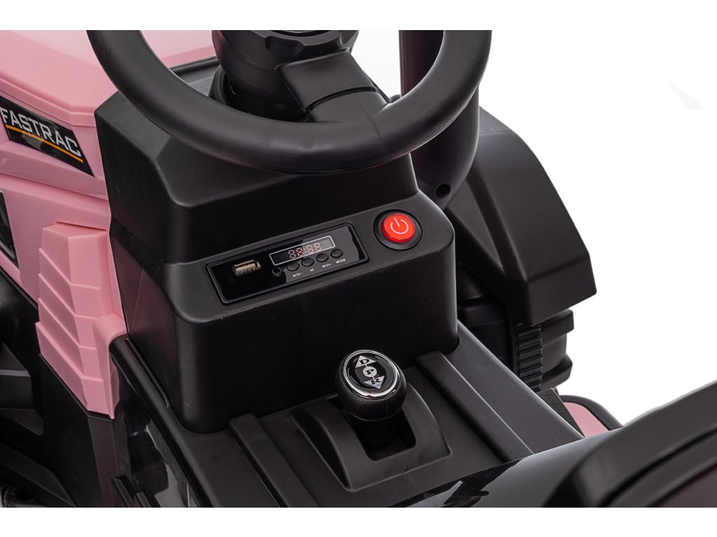 Pohodlné sedadlo s bezpečnostními pásy zajišťuje bezpečí dítěte během jízdy. Hudební panel s USB, AUX vstupem a slotem pro paměťovou kartu nabízí zábavu a interaktivitu. Přední světla přispívají k realističtějšímu vzhledu traktoru.