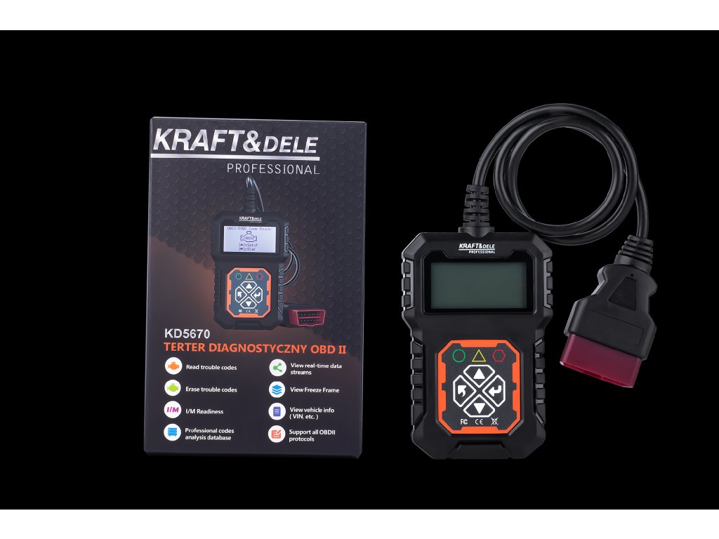Profesionální diagnostický skener značky Kraft&Dele, model KD5670, podporuje diagnostiku v plném režimu OBD (podpora řídicí jednotky motoru).