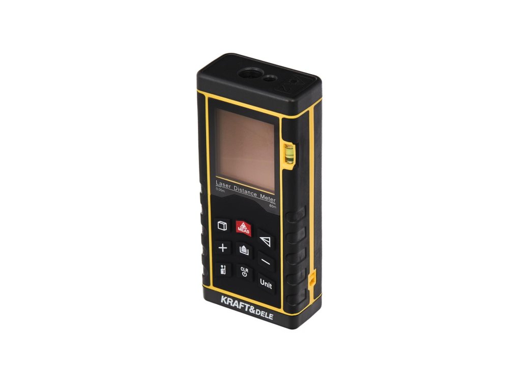 Laserový měřič vzdálenosti české značky Kraft&Dele usnadňuje měření vzdálenosti. Červený laserový paprsek ukáže směr, díky čemuž přesně zasáhnete požadované místo. Vestavěná vodováha pomáhá kontrolovat úhel náklonu během měření. Přístroj je navíc vybaven funkcí ukládání měření (4 měření v paměti zařízení) a zvukovou signalizací.