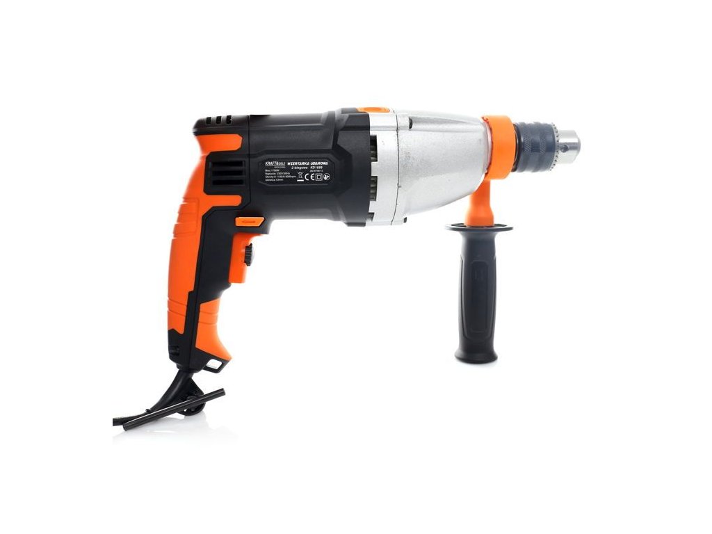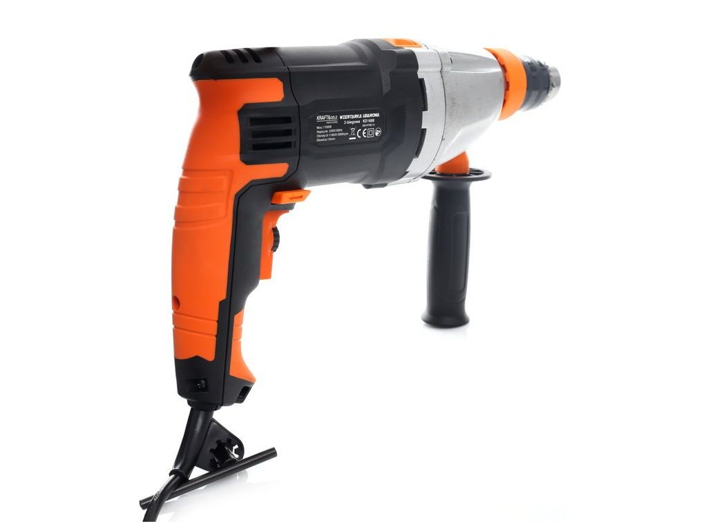 Elektrická příklepová vrtačka Kraft&Dele KD1688 s výkonem 1700W určená k příklepovému vrtání v cihlách, betonu a kameni, stejně jako k vrtání v kovu, keramice, dřevě a plastu. Hlavní rukojeť je vyrobena ze speciálního protiskluzového materiálu, který usnadňuje držení přístroje v ruce. Verze je vybavena přídavnou boční rukojetí. Zařízení má elektronické řízení a možnost otáčení ve směru i proti směru hodinových ručiček, což umožňuje utahování i závitování. Hlavička je kovová.