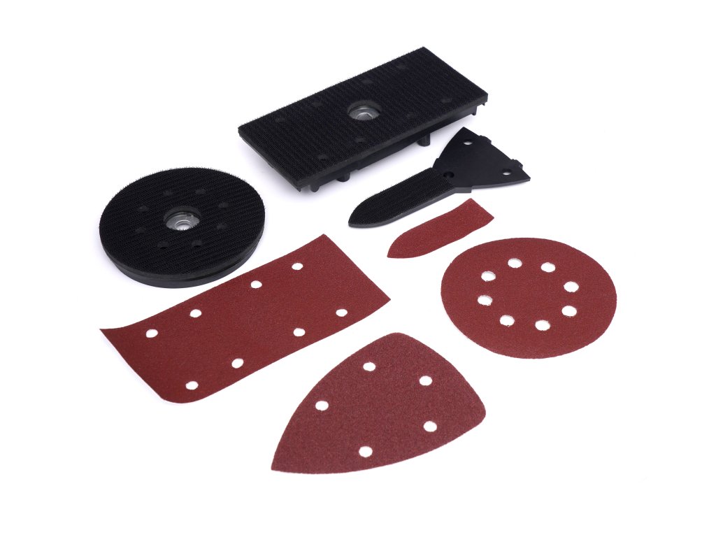 - Velikosti brusného papíru: 140 x 140 x 100 / 90 x 187 / 30 x 90 / průměr 125 mm