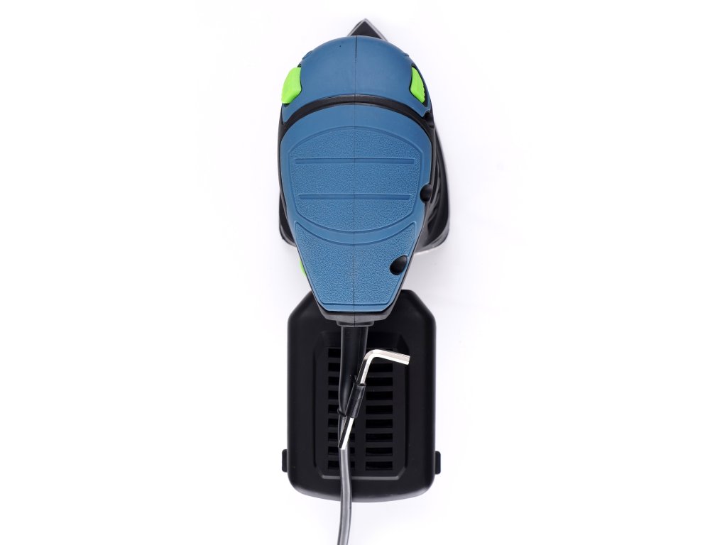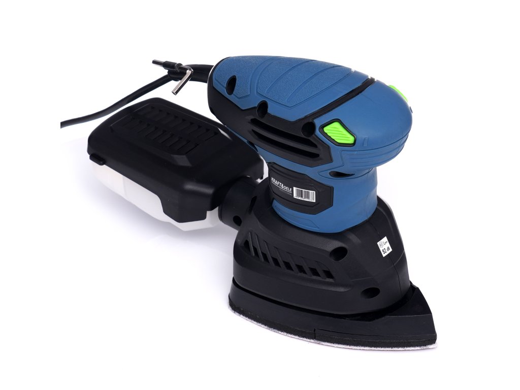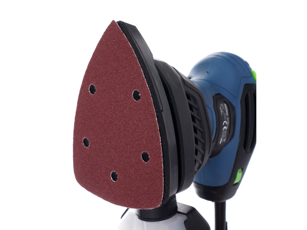 Bruska je určena pro praváky i leváky. Výměna brusného papíru probíhá bez nástrojů, talíře jsou upevněny na suchý zip. V balení je také pytel na prach, který udržuje pracovní místo v čistotě.