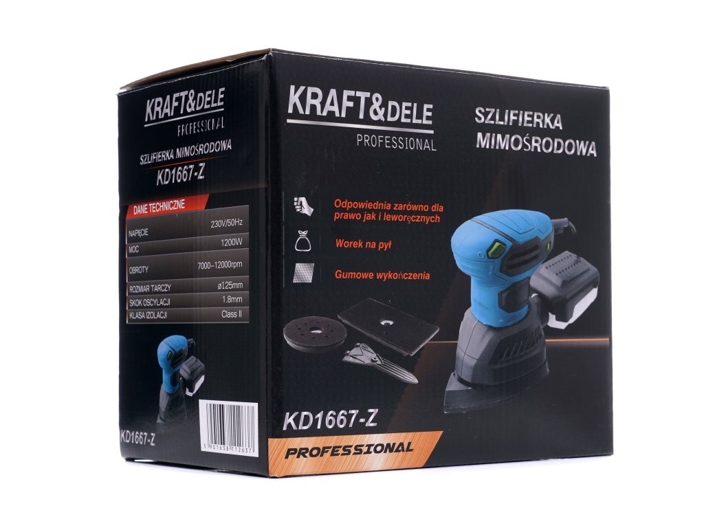 Excentrická bruska 1200 W KD1667-Z od české značky Kraft&Dele umožňuje mimo jiné broušení a leštění povrchů. Je určená pro práci se dřevem, kovem, omítkou i plasty.