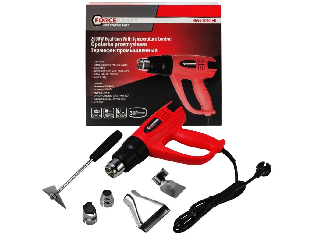 FORCEKRAFT Elektrická horkovzdušná pistole 2000 W, 3 stupně, 4 trysky, 600 °C, na dřevo a barvy
