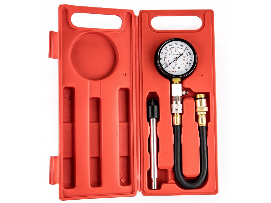 Sada pro testování komprese Forcekraft je spolehlivý dílenský nástroj určený k diagnostice benzínových motorů. Umožňuje přesné měření tlaku ve válcích, což pomáhá posoudit technický stav motoru a odhalit problémy jako opotřebení pístních kroužků, ventilů nebo těsnění hlavy válců.