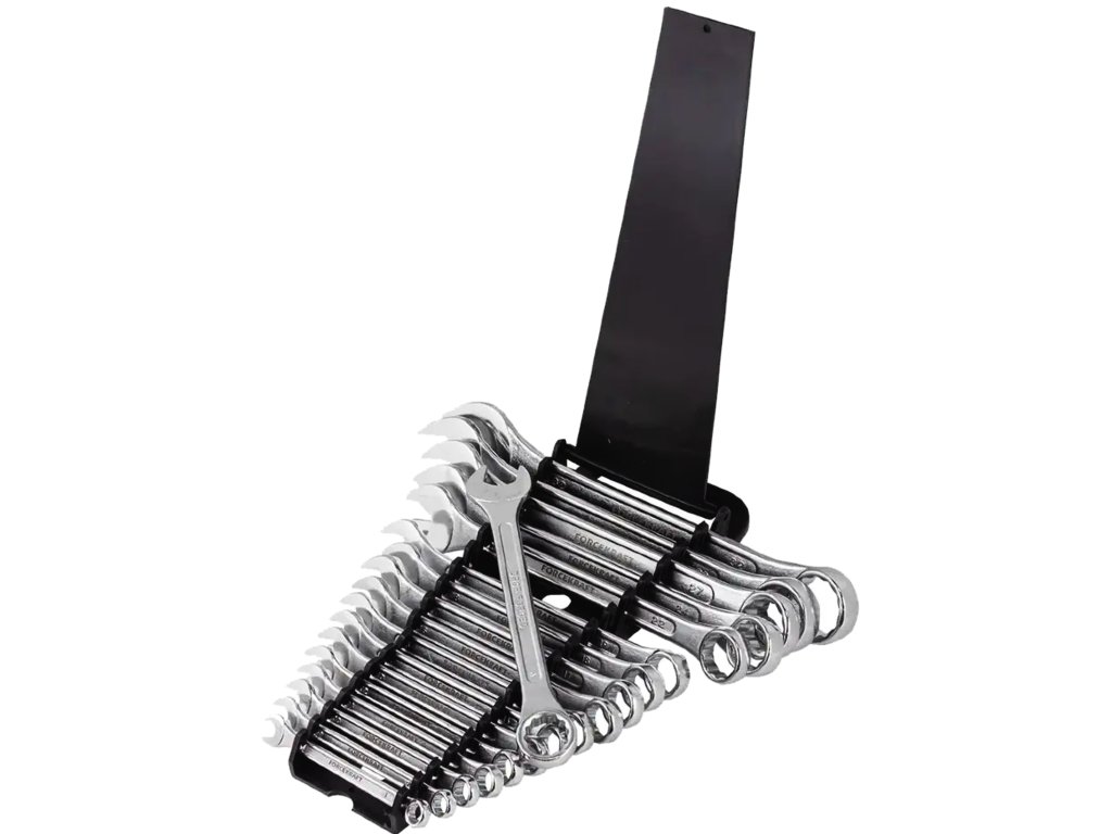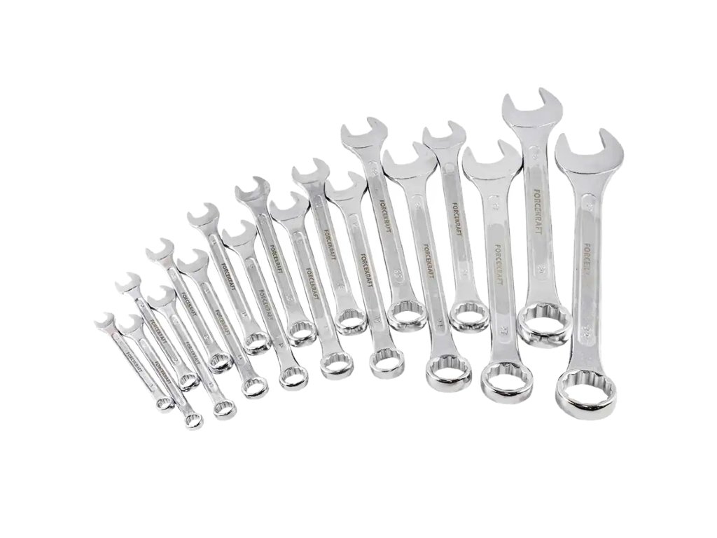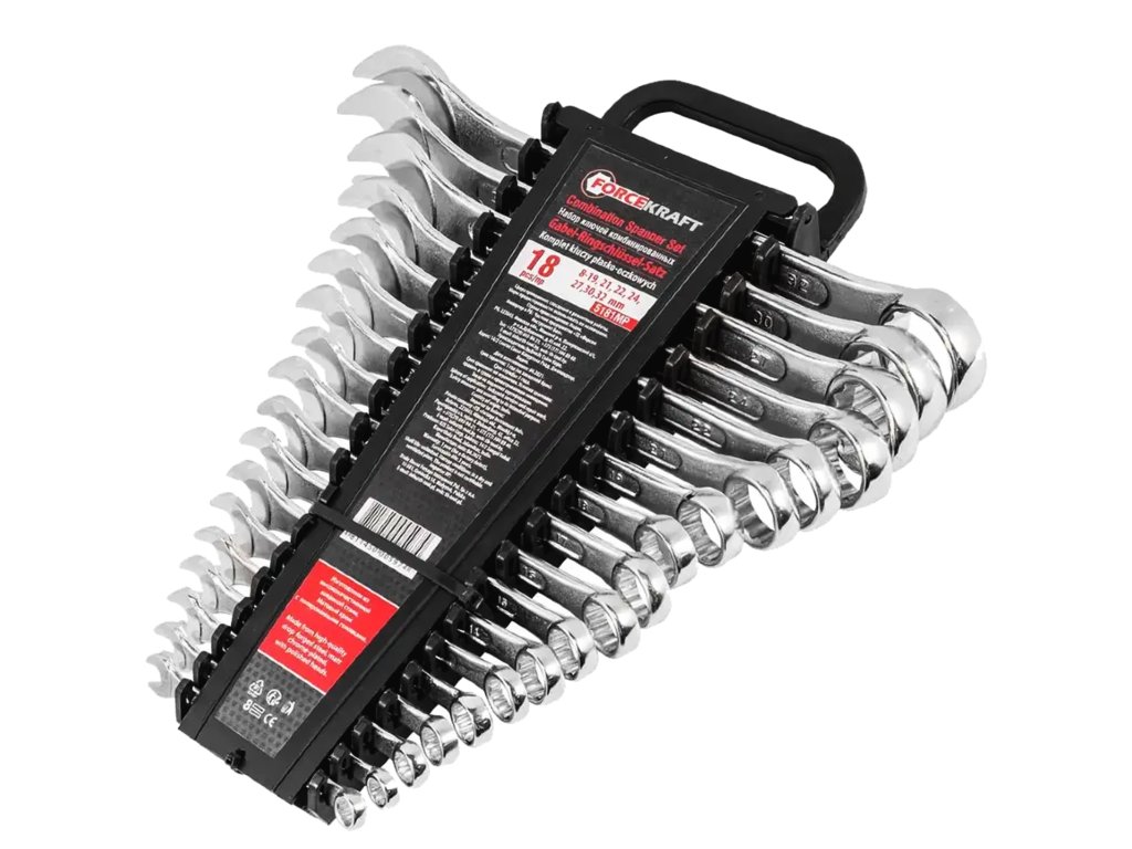 Sada 18 vysoce kvalitních kombinovaných klíčů Forcekraft jsou spolehlivé nástroje pro montáž a demontáž šroubových spojů. Vyrobené z chrom‑vanadiové oceli (CrV) a v souladu s normami DIN 3113 / ISO zaručují odolnost, odolnost proti korozi a vysoký komfort při práci.