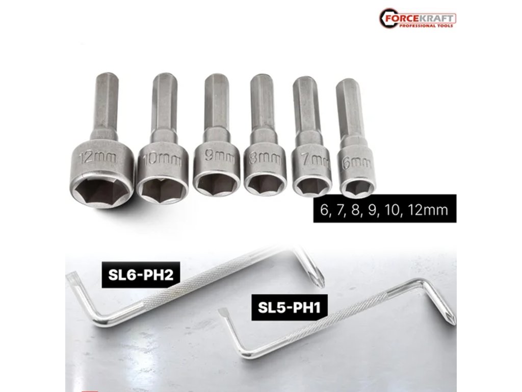 Sada šroubováků a bitů 100 dílů značky Forcekraft je univerzálním řešením pro kutily, servisní techniky i profesionály, kteří potřebují široký výběr nástrojů pro práci s různými druhy a rozměry spojovacího materiálu. Obsahuje bohatou nabídku šroubováků, bitů, nástrčných hlavic a držáků, což z ní činí kompletní vybavení do dílny, garáže i pro domácí použití.