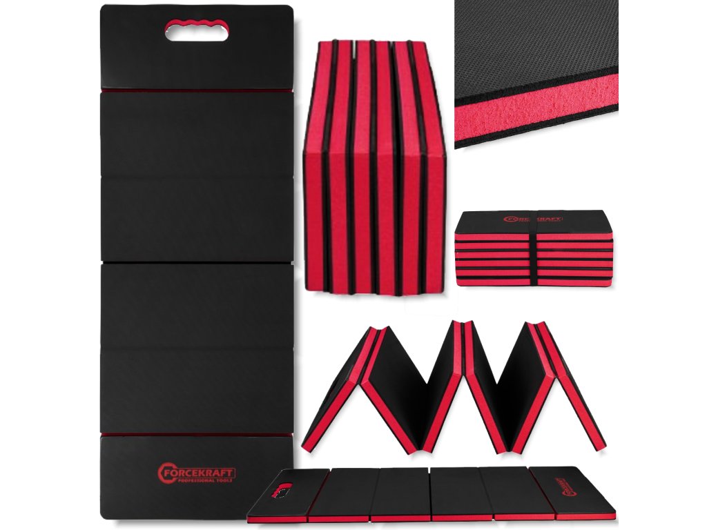 Skládací dílenská podložka Forcekraft je univerzální pomůcka pro každého, kdo pracuje na autech, na zahradě, v garáži nebo při domácích pracích. Díky vysoké odolnosti proti oleji, benzínu a vodě je podložka vhodná jak pro intenzivní dílenské použití, tak pro nouzové opravy v terénu.
