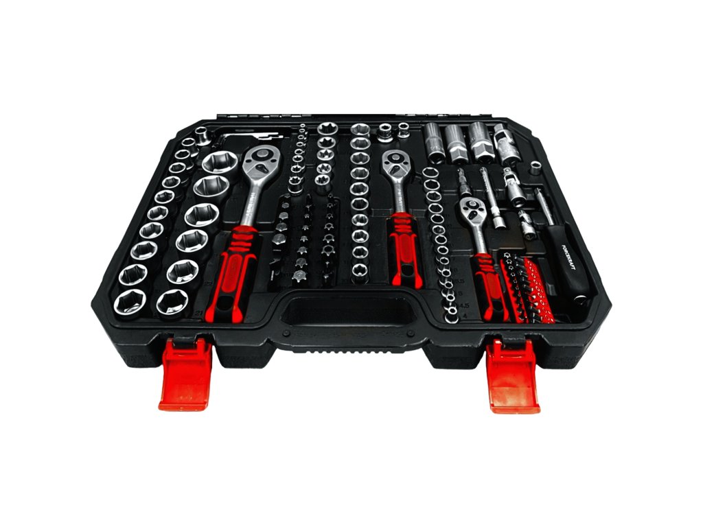 Celá sada je uložena v velmi odolném kufru z plastu AV5 – odolném proti nárazům a deformacím. Přezky zaručují pevné uzavření a nový uspořádání prvků umožňuje rychlý přístup a pohodlnou organizaci nářadí.
