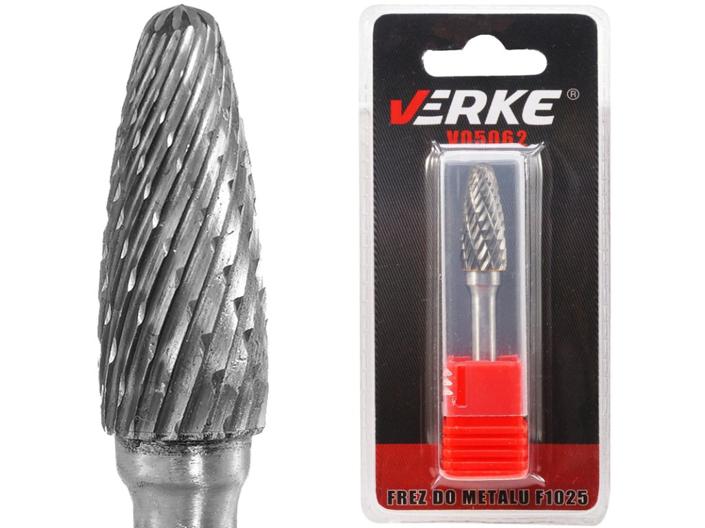 Fréza F1025 VERKE je vybavena dvojitými šikmými noži určenými pro všeobecné použití. Tvoří krátké třísky, které se snadno odstraňují, a umožňuje rovnoměrnou práci při obrábění tažné oceli. Je ideální pro tvarování, vyhlazování a odstraňování materiálů jako je: kalená ocel (HRC65), nerezová ocel, litina, neželezné kovy, keramika, plast, dřevo. Fréza je vyrobena z karbidu wolframu, což kombinuje vysokou teplotu varu (6000 °C) s výjimečnou pevností.