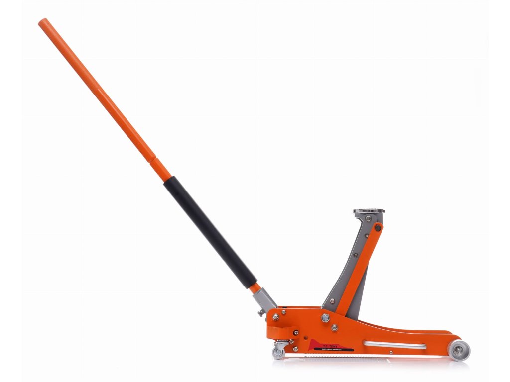 Hydraulický nízkoprofilový zvedák je vybaven ocelovými koly na přední nápravě a ložiskovými otočnými koly na zadní nápravě. Má také otočnou základnu a pedál rychlého zdvihu.
