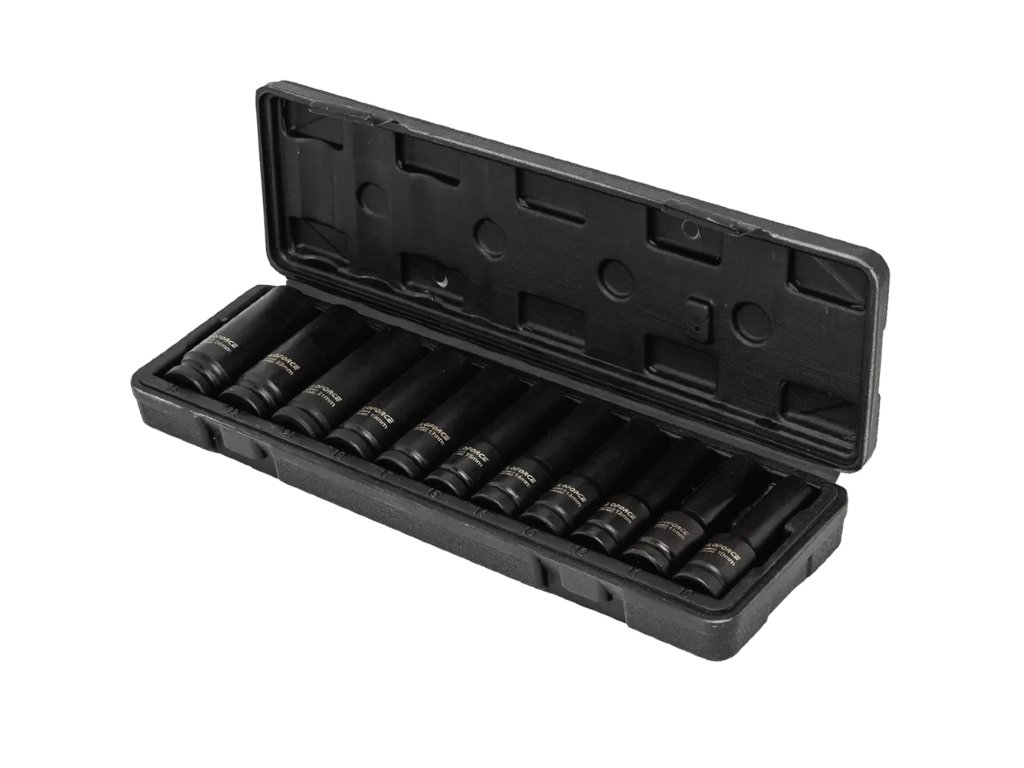 Sada 11 hlubokých rázových hlavic 1/2" představuje spolehlivé a odolné nářadí, které se výborně hodí do náročných pracovních podmínek — jak v profesionálních autoservisech, tak v průmyslu nebo stavebnictví. Vyrobené z kvalitní oceli chrom-molybden (Cr-Mo), zajišťují odolnost vůči přetížení, nárazům a intenzivnímu používání.