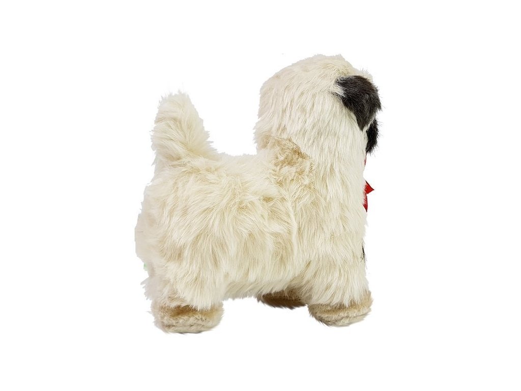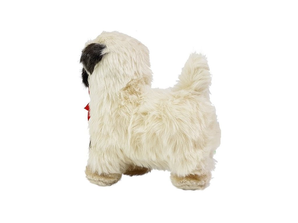 Psiček má krémovou srst s černými detaily na tlamě a uších, tmavě hnědé oči upoutají pozornost. Je to dokonalá replika psička této rasy. Navíc mu krásná červená mašlička na krku dodává kouzlo.