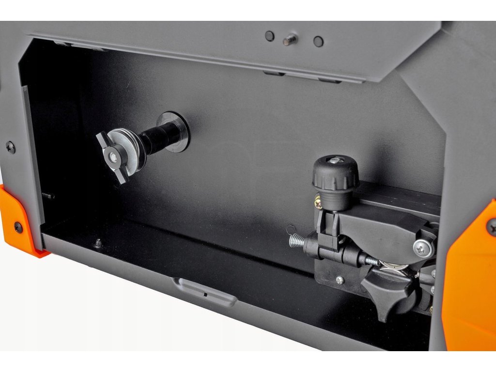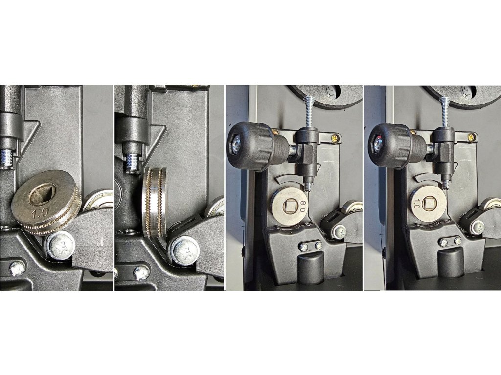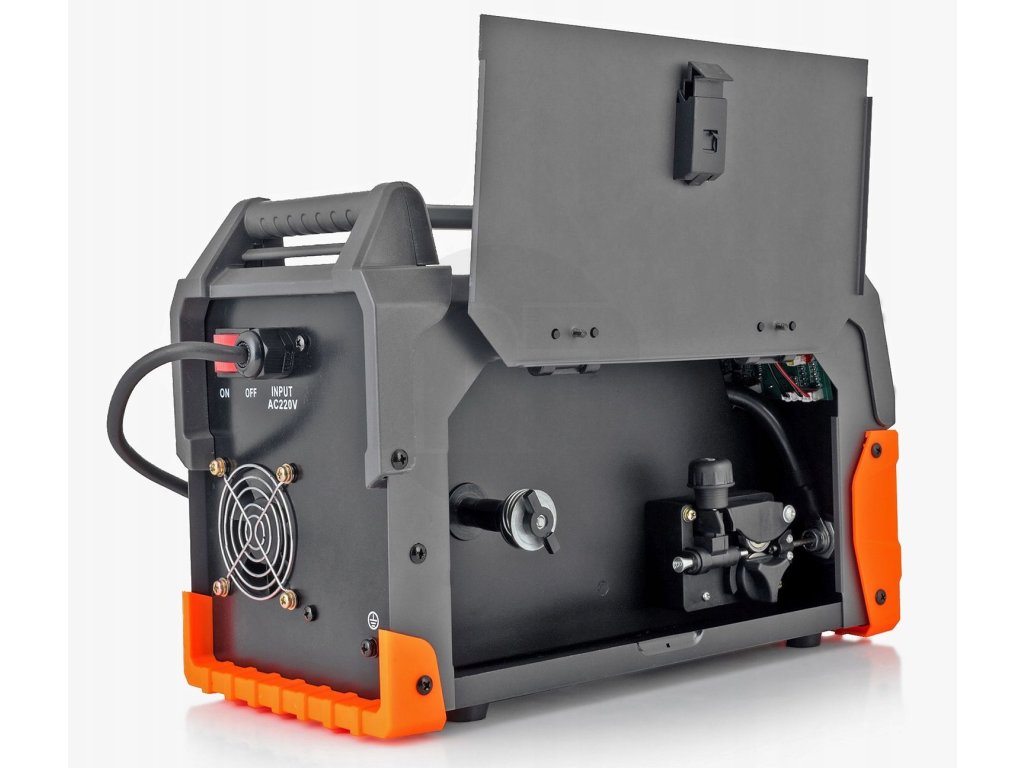- Drát FLUX: Sváření práškovým drátem 0,8-1,0 mm, s možností nastavení proudu a rychlosti vytažení drátu otočnými knoflíky.