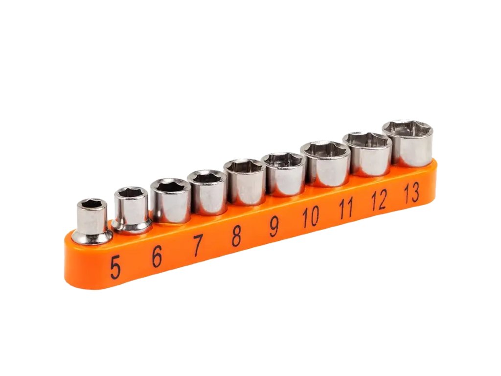 - 9 ks nástrčných hlavic 1/4": 5, 6, 7, 8, 9, 10, 11, 12, 13 mm