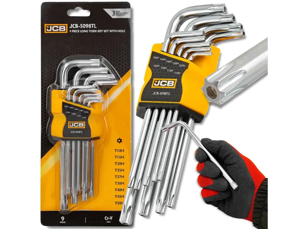 Sada 9 dlouhých TORX klíčů s otvorem (bezpečnostní TORX, typ H/TN) značky JCB jsou nepostradatelným nářadím pro práci s komponenty zajištěnými bezpečnostními šrouby. Díky přítomnosti otvoru v čepu (uprostřed hrotu) umožňují klíče našroubování a vyšroubování speciálních zajišťovacích šroubů používaných např. v elektronice, alarmových systémech, průmyslové automatizaci, servisu domácích spotřebičů a RTV či v automobilech.