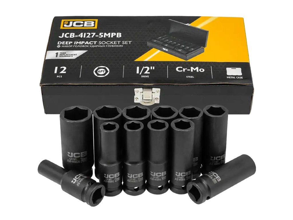 Sada 12 hlubokých rázových hlavic JCB Tools JCB-4127-5MPB je profesionální nástroj určený pro intenzivní dílenské práce, včetně montáže a demontáže šroubů a matic pomocí rázových utahováků.