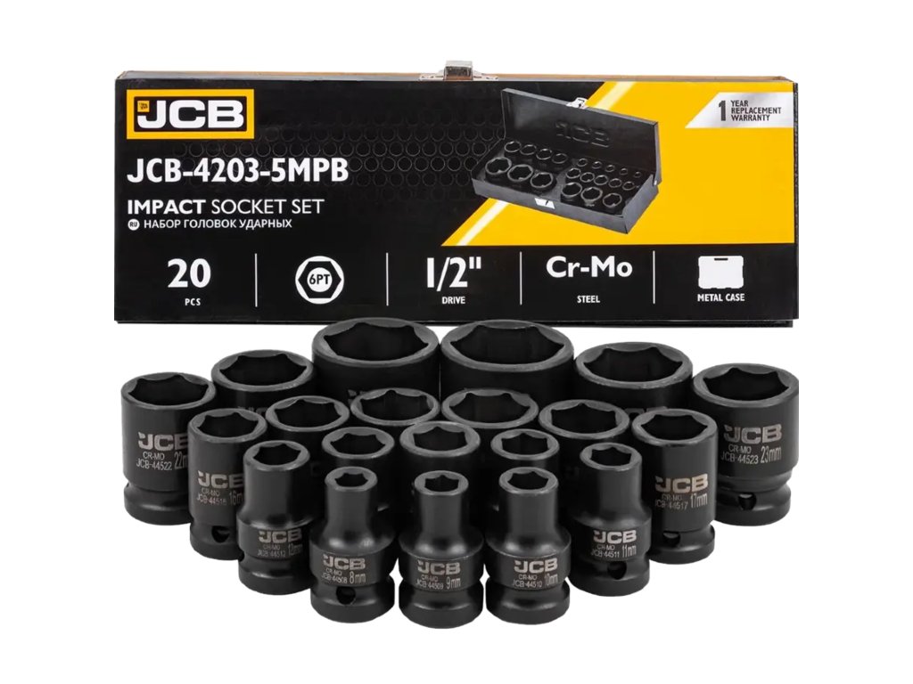 JCB Sada rázových 6hranných hlavic 1/2" Cr-Mo, 20 ks, 8–32 mm