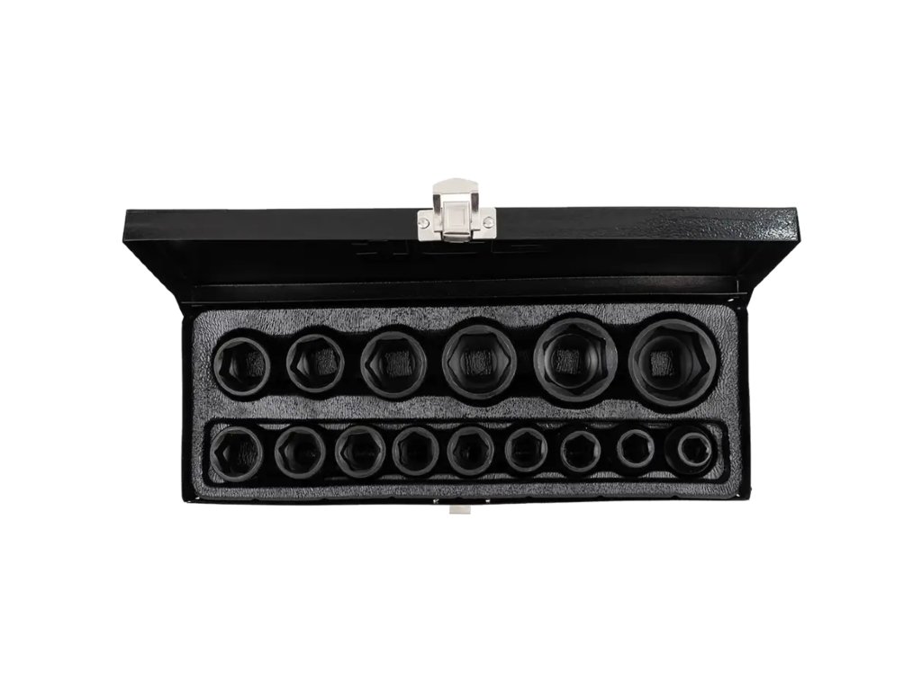 Hlavice mají šestihranný profil, který zajišťuje pevné usazení na šroubech a maticích a bezpečné přenášení vysokých točivých momentů bez rizika prokluzu. Celá sada je uložena v robustním kovovém kufříku, který usnadňuje skladování a přepravu.
