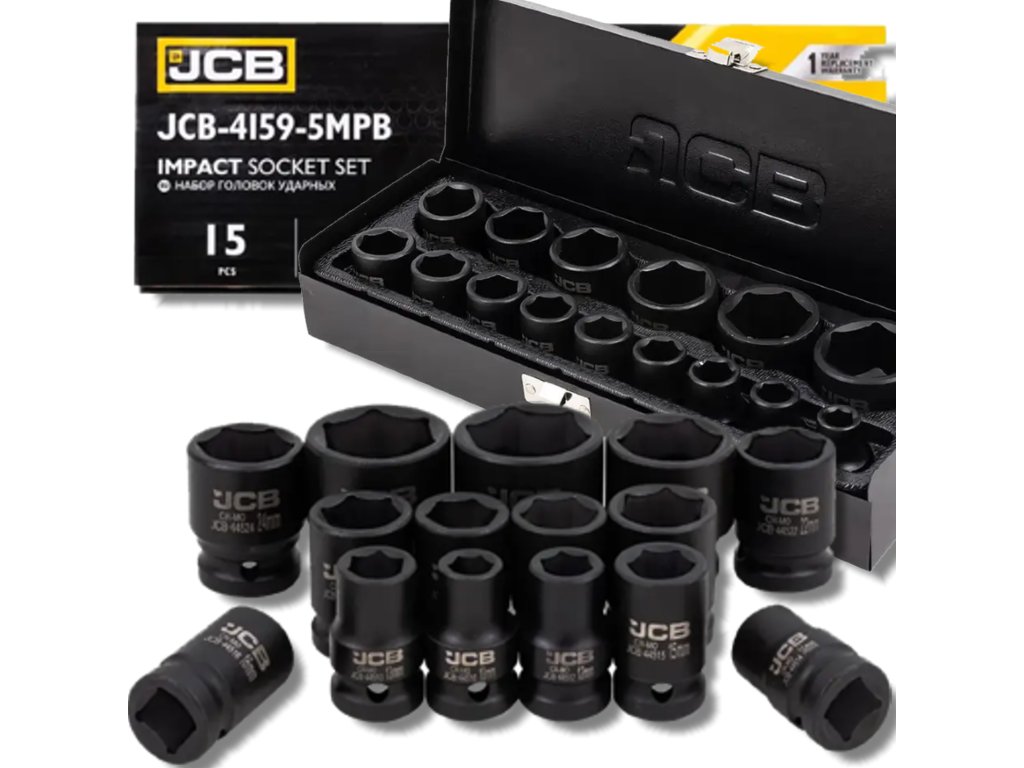 JCB-4159-5MPB je kompletní sada 15 rázových hlavic určená pro nejnáročnější úkoly v dílnách, autoservisech a při montážních pracích. Vyrobené z vysoce pevné oceli Cr-Mo (chrom-molybdenové), hlavice nabízejí vynikající odolnost proti praskání, nárazům a deformacím, i při použití s pneumatickými nebo elektrickými rázovými utahováky.