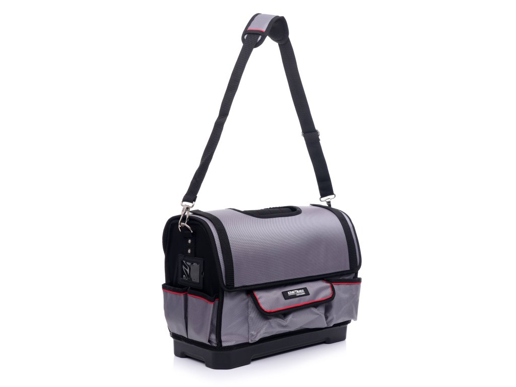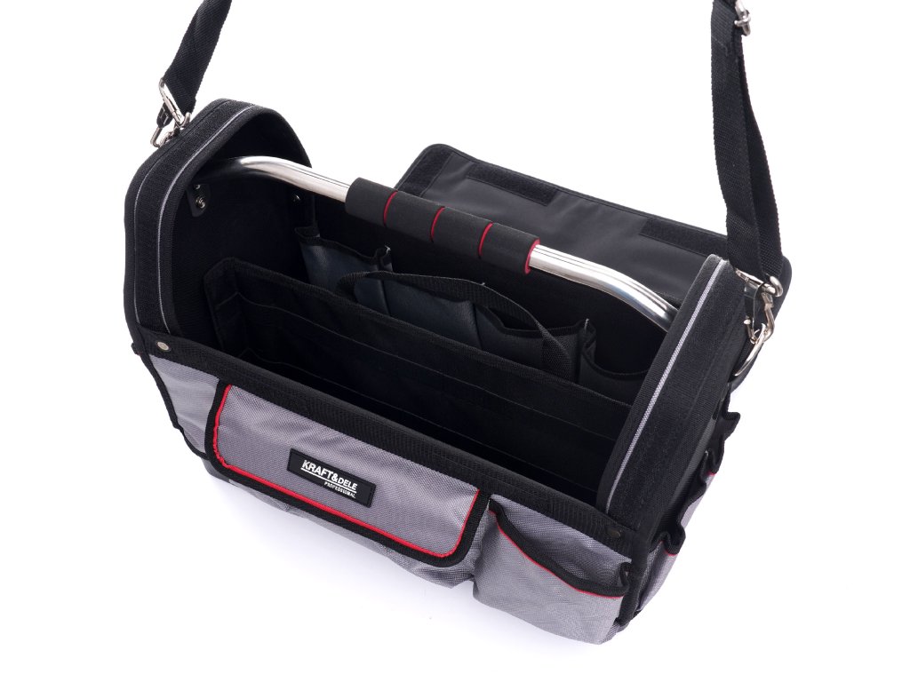 Taška na nářadí s klopou 18" značky Kraft&Dele je ideálním organizérem nářadí pro všechny montéry (elektrikáře, instalatéry, obkladače apod.). Pevné dno pokryté kompozitním materiálem zaručuje odolnost a mnoho kapes přispívá k pořádku a rychlému přístupu k potřebným nástrojům.
