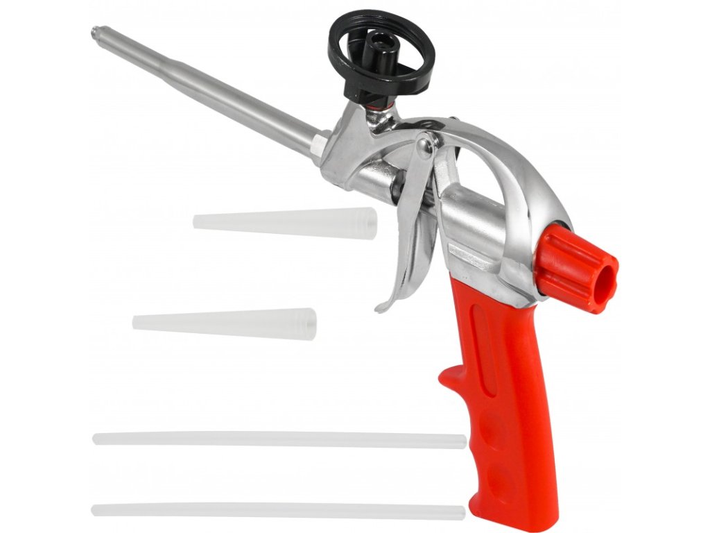 Pistole na montážní pěnu je určený pro přesné dávkování PU pěny z běžně dostupných tlakových nádob. Umožňuje opakované použití a usnadňuje takové práce jako: těsnění, montáž oken a dveří, vyplňování mezer v izolaci, těsnění a izolace dělících příček a zateplení stěn a střech.