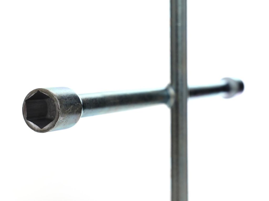 Praktický klíč na kola automobilů. Vyrobený podle normy DIN899. Má 4 ramena s šestihrannými nástavci ve velikostech 17 mm, 19 mm, 21 mm a 23 mm.