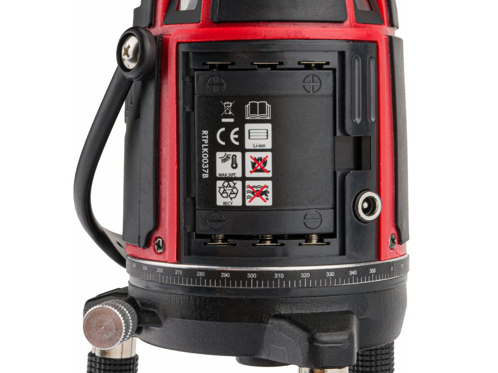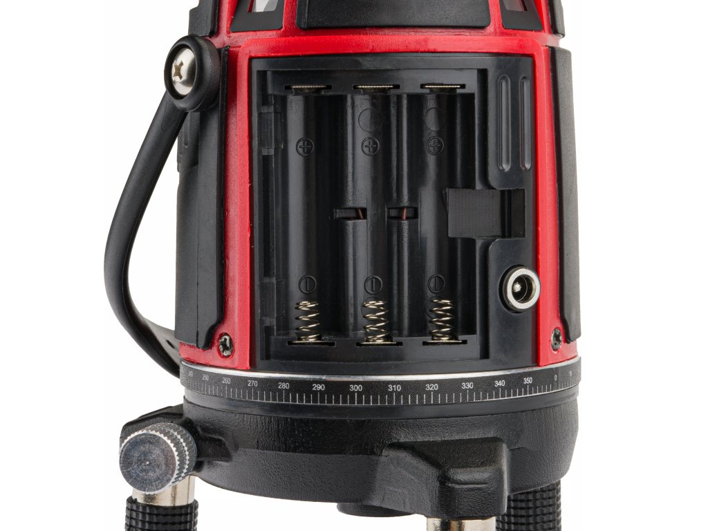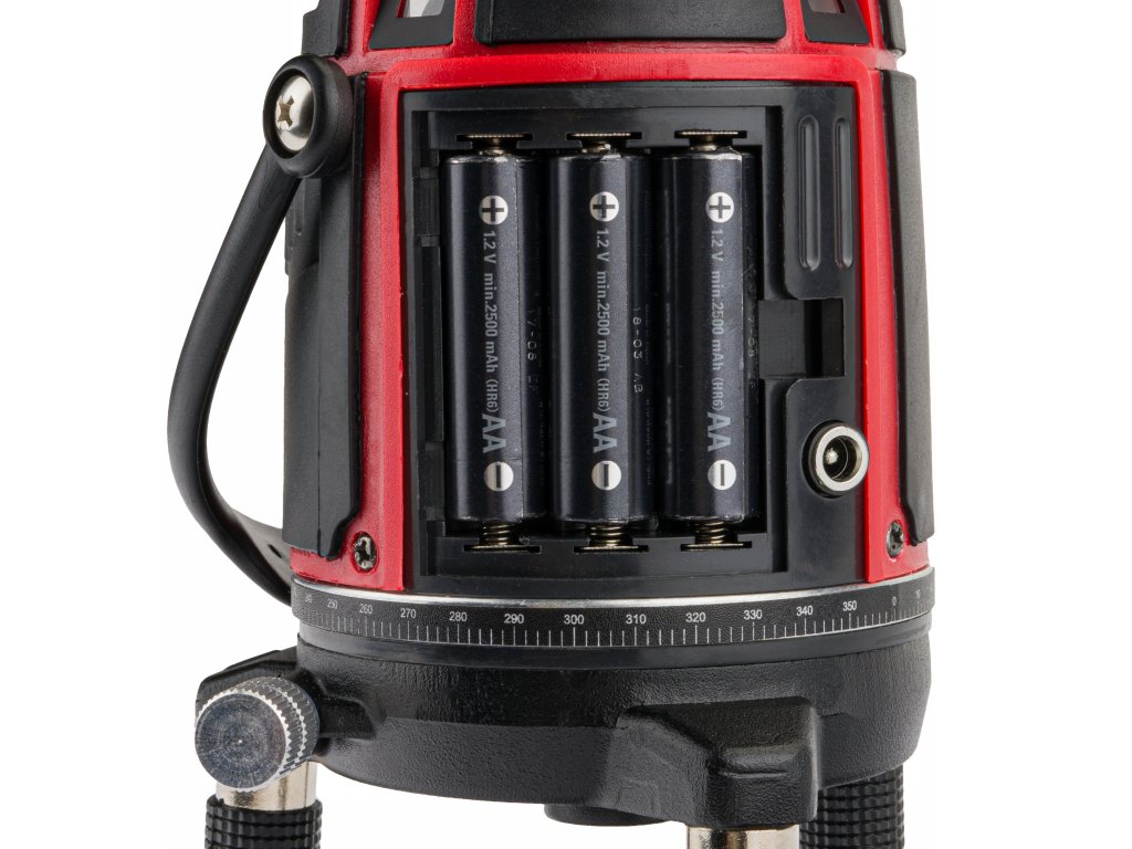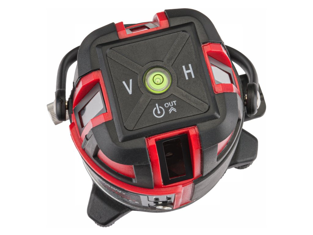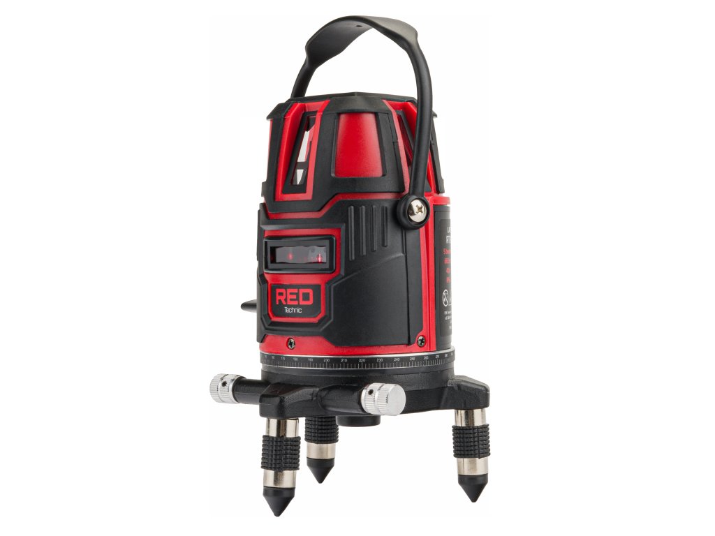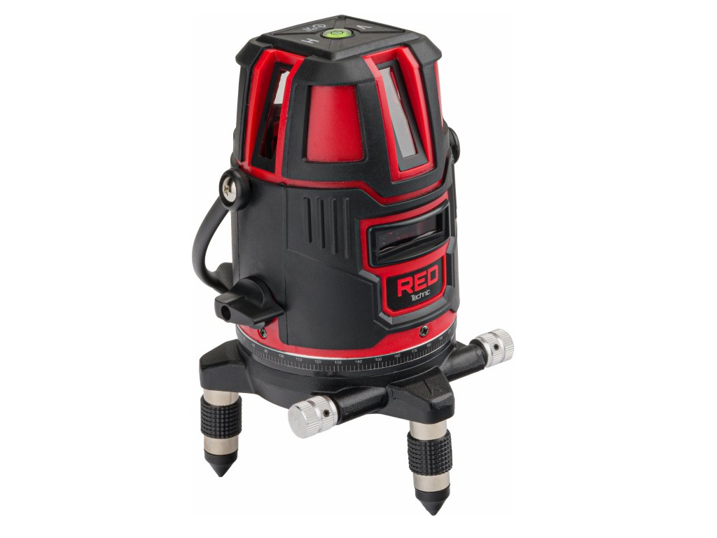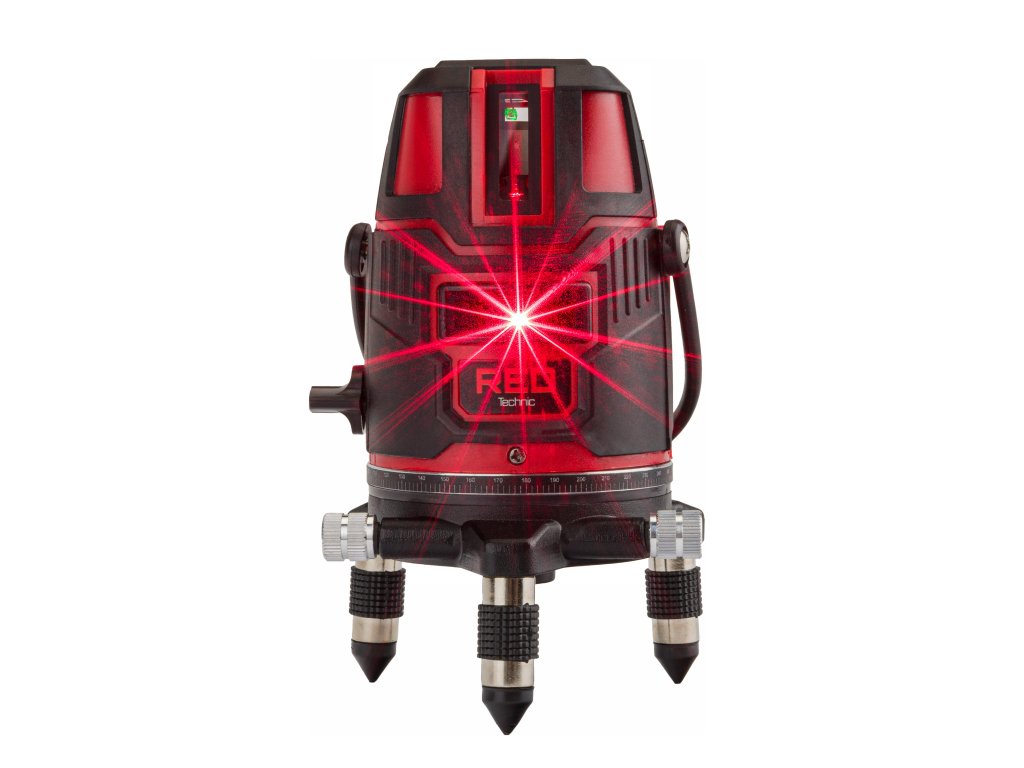 - Křížový laser generuje jeden horizontální paprsek a čtyři vertikální paprsky, které se protínají pod úhlem 90°.