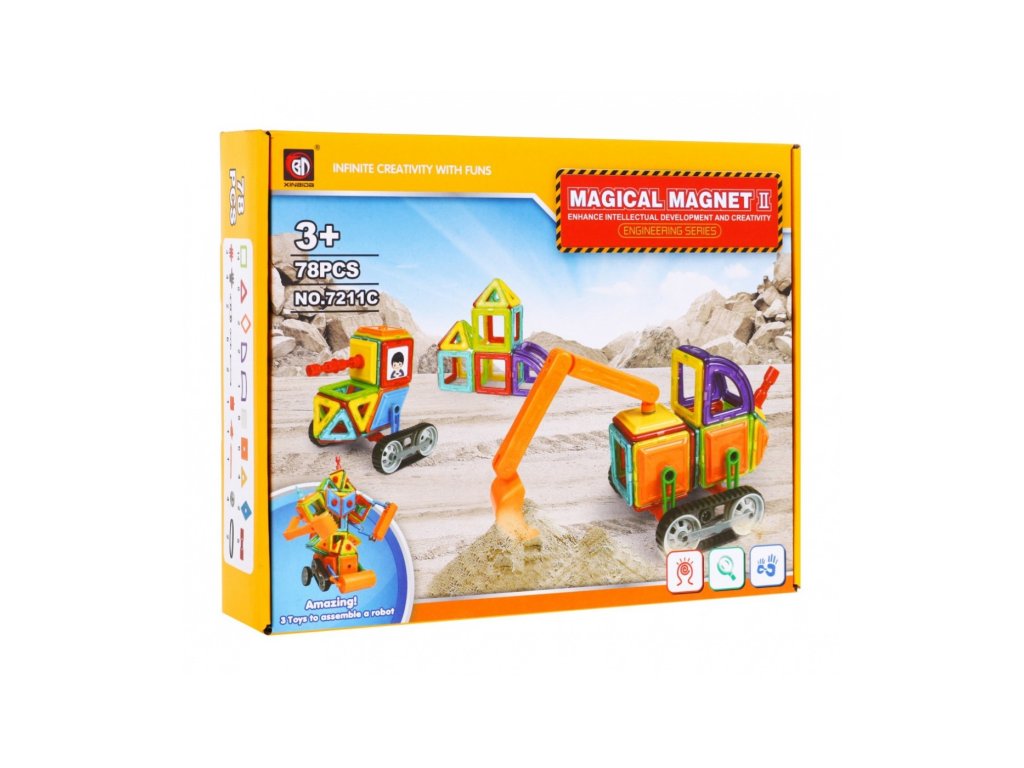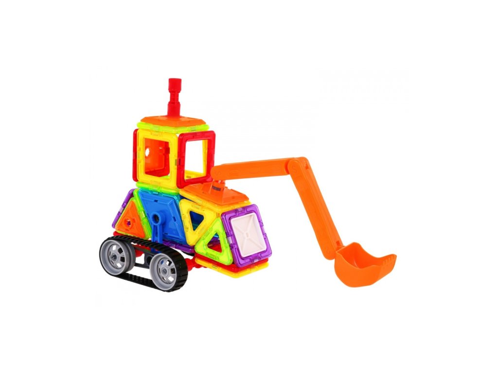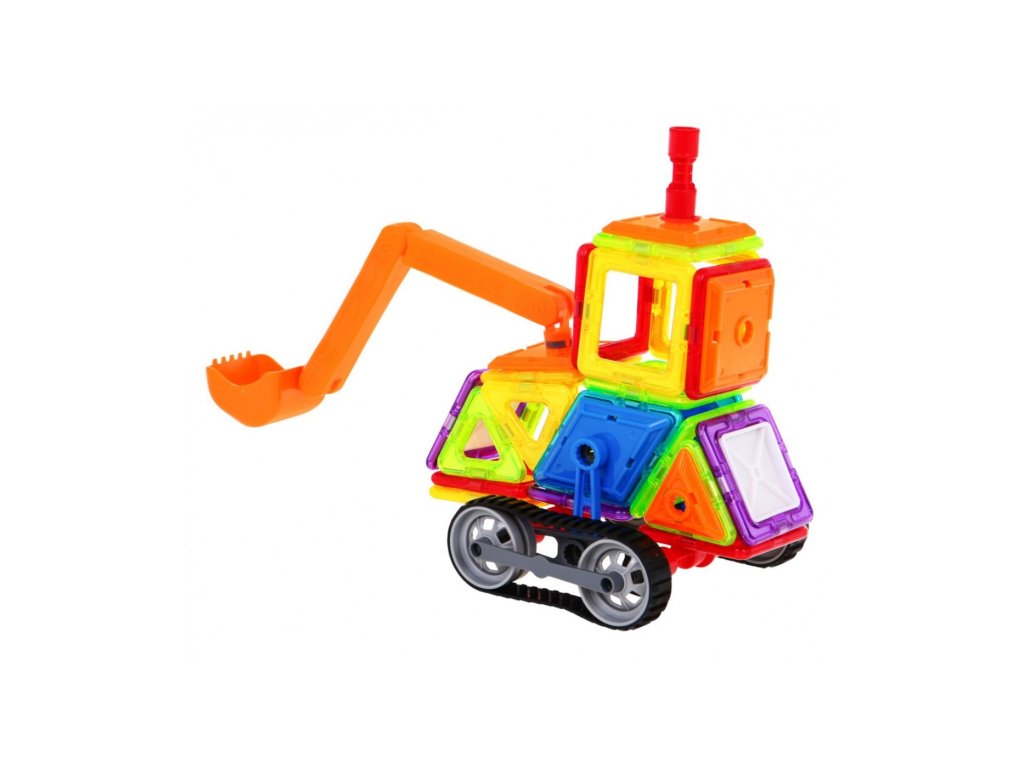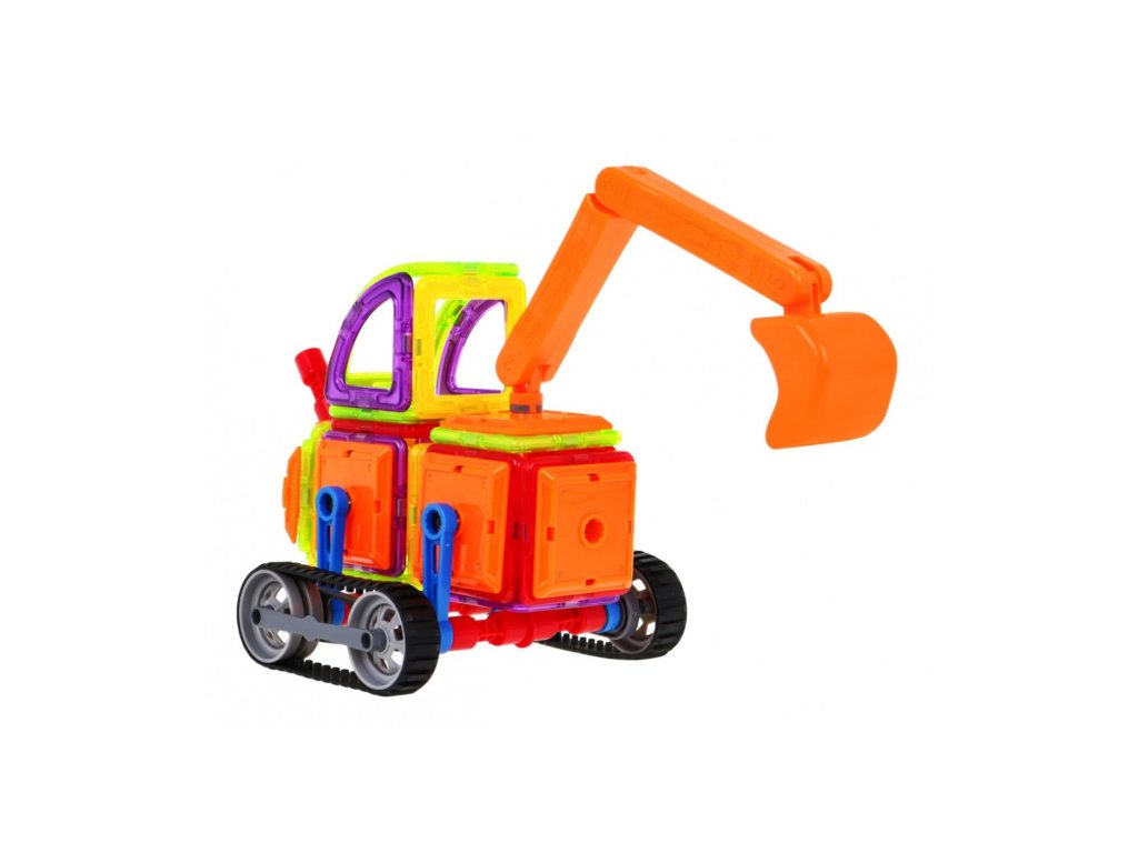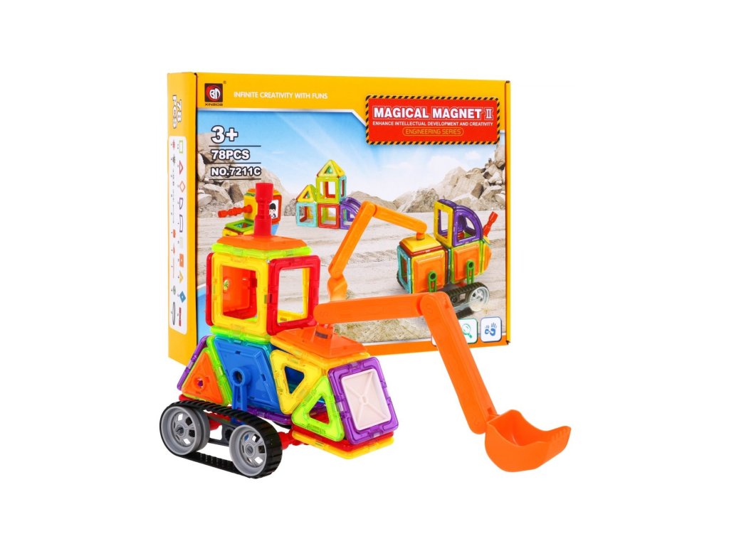 Magnetická stavebnice bagru se skládá ze 78 dílů. Součástí dětské hračky jsou dekorativní samolepky. Hračka u dětí rozvíjí kreativitu a procvičuje jemnou motoriku. Součásti balení je obrázkový návod podle, kterého lze sestavit různé vozidla.