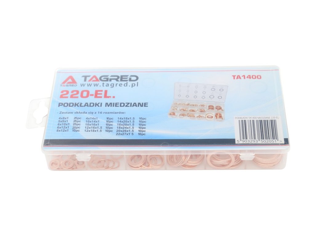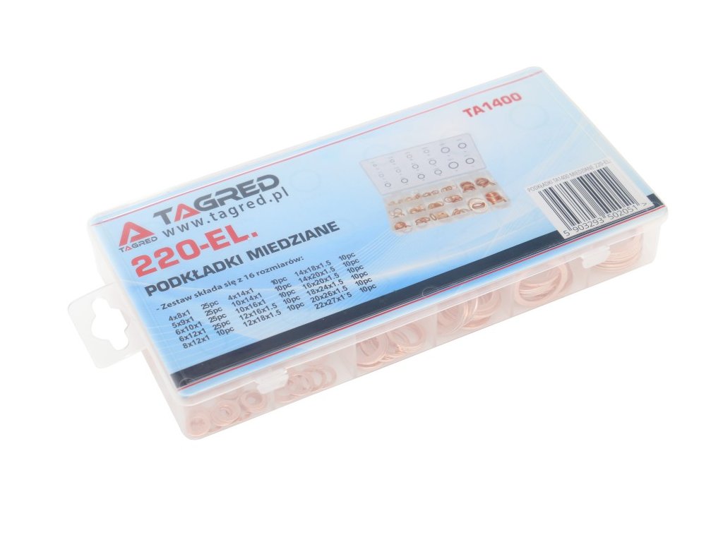 Set obsahuje 220 kusů měděných podložek, které jsou uloženy v praktickém organizéru pro snadný přehled a použití.