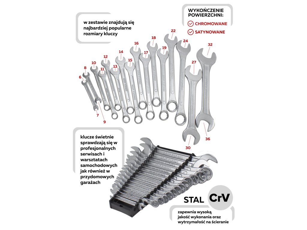 - Očkoploché klíče: 10 mm, 11 mm, 12 mm, 13 mm, 14 mm, 15 mm, 16 mm, 17 mm, 18 mm, 19 mm, 22 mm, 24 mm