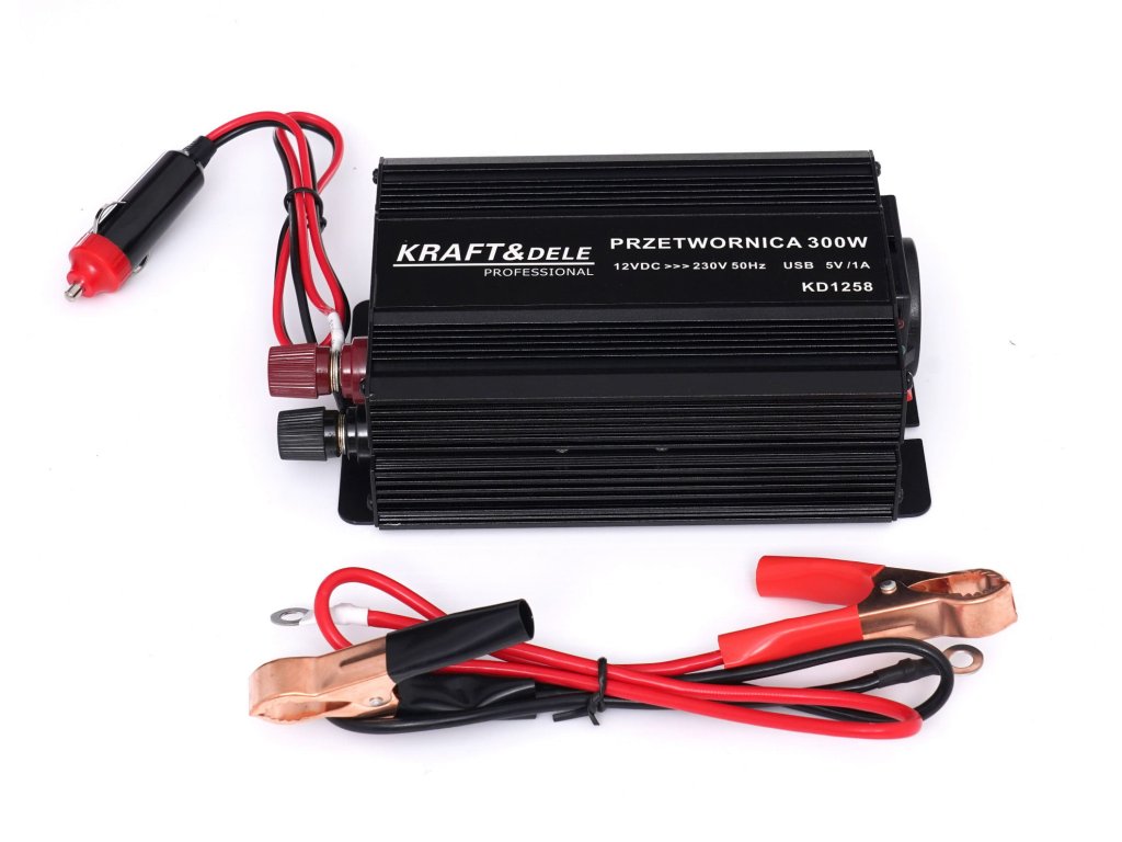 Měnič proudu 12VDC na 230VAC umožňuje připojení elektrických přístrojů napájených z automobilové baterie. Speciálně navržený obvod umožňuje vyrobit proud s trvalým výkonem 300W a špičkovým (pulzním / krátkodobým) výkonem až 600W. Zařízení je vybaveno funkcí automatického vypnutí při příliš vysokém nebo nízkém vstupním napětí, ochranou proti přehřátí, přetížení a také pojistkou proti zkratu.