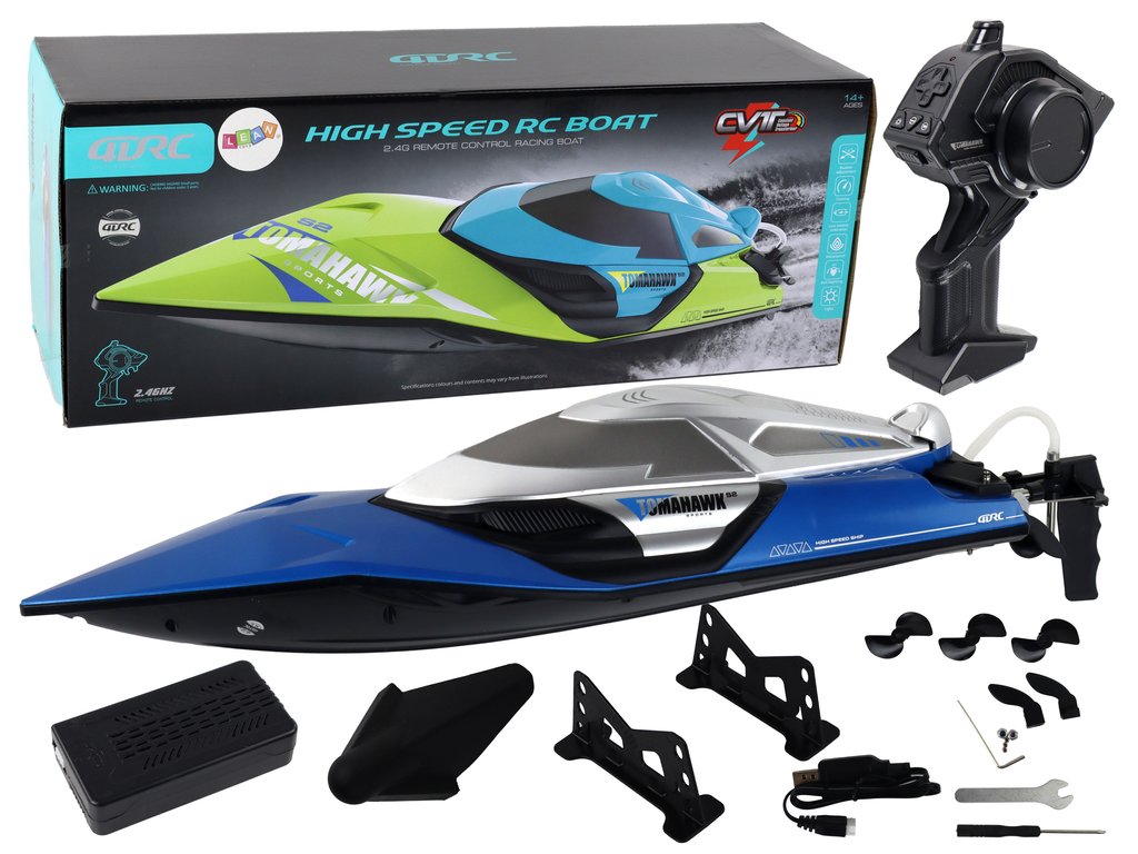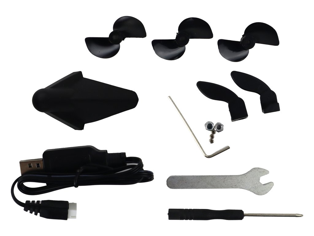 - Nabíjecí kabel, baterie, náhradní vrtule, kormidla a stojan na motorový člun součástí balení