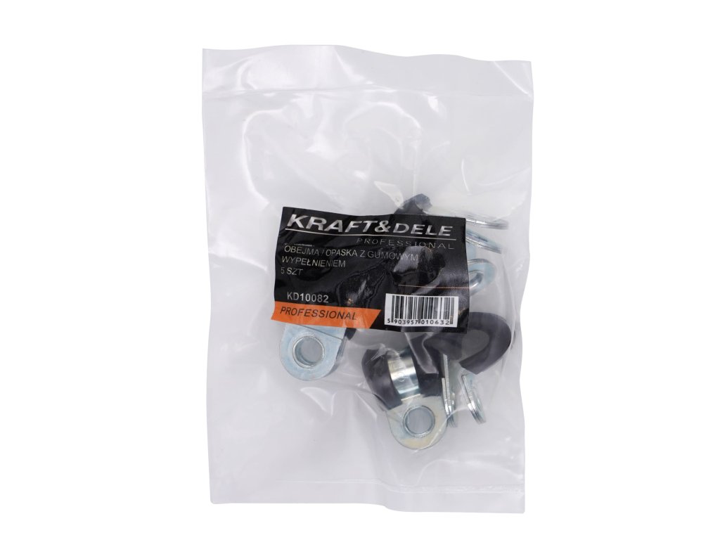 Profesionální stahovací spony značky Kraft&Dele, model KD10082, určené k upevnění trubek, hadic, vodičů a různých kabelů. Objímky s gumovou vložkou se používají v automobilovém průmyslu, strojírenství, stejně tak v hydraulických systémech a tlakových technikách při stavbě lodí, chladicích zařízení a dalších.