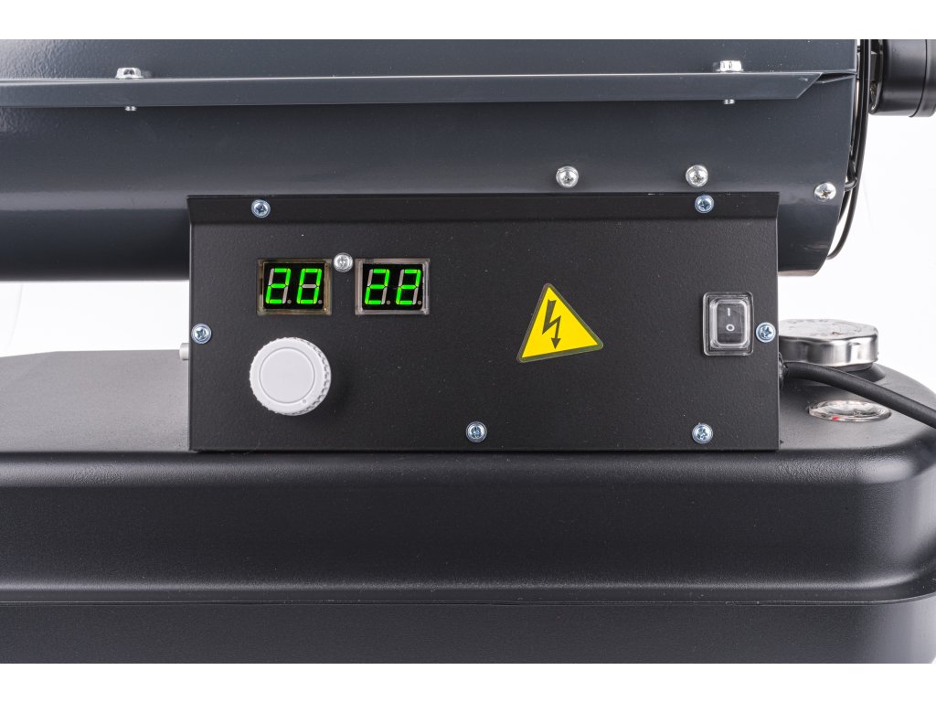 Ohřívač je vybaven digitálním termostatem s plynulou regulací teploty, což zajišťuje vysokou tepelnou účinnost a úsporu paliva.