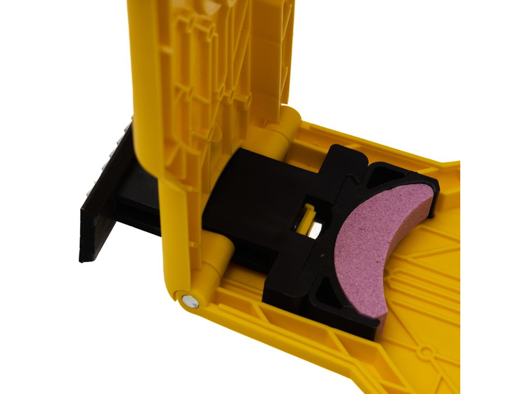 Ostřič je vybaven dvěma montážními úchyty. Jeden je pevný, druhý pohyblivý (lze jej vyjmout). Díky tomu lze ostřič přizpůsobit různým typům řetězů.