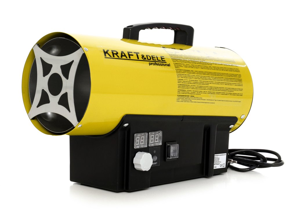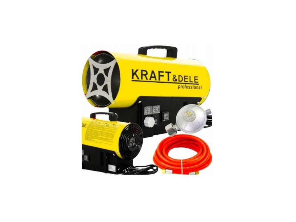Ohřívač vzduchu značky Kraft&Dele model KD11700 s výkonem 25 kW na plyn propan-butan (LPG). Ohřívač má vestavěný termostat s regulací teploty a digitální displej, díky kterému lze snadno nastavit požadovanou teplotu prostředí. Ohřívač pracuje automaticky podle nastavení teploty.