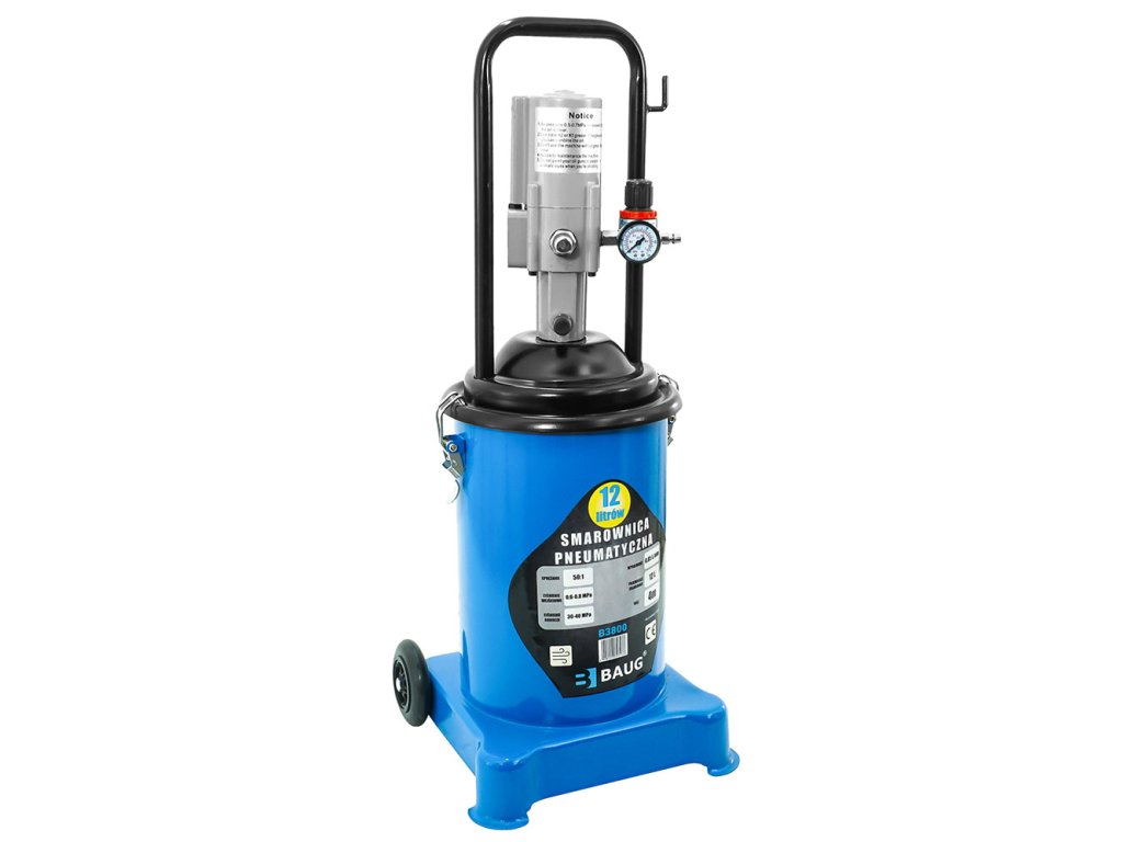 Profesionální pneumatická maznice značky BAUG je určena pro tlakovou lubrikaci mechanických součástí, jako jsou čepy, ložiska, klouby apod. Je vyrobena z ocelového válce o kapacitě 12 l, což umožňuje nepřetržitý a efektivní provoz. Celá konstrukce je z vysoce kvalitních materiálů, které jsou odolné vůči dlouhodobému působení maziv a olejů. Všechny těsnění a ventily jsou vyhotoveny s maximální precizností a umožňují práci pod tlakem až 40 MPa. V balení jsou dvě koncovky, pevná a ohebná, kompatibilní s většinou mazniček. Kolečka zajišťují mobilitu a snadný transport.