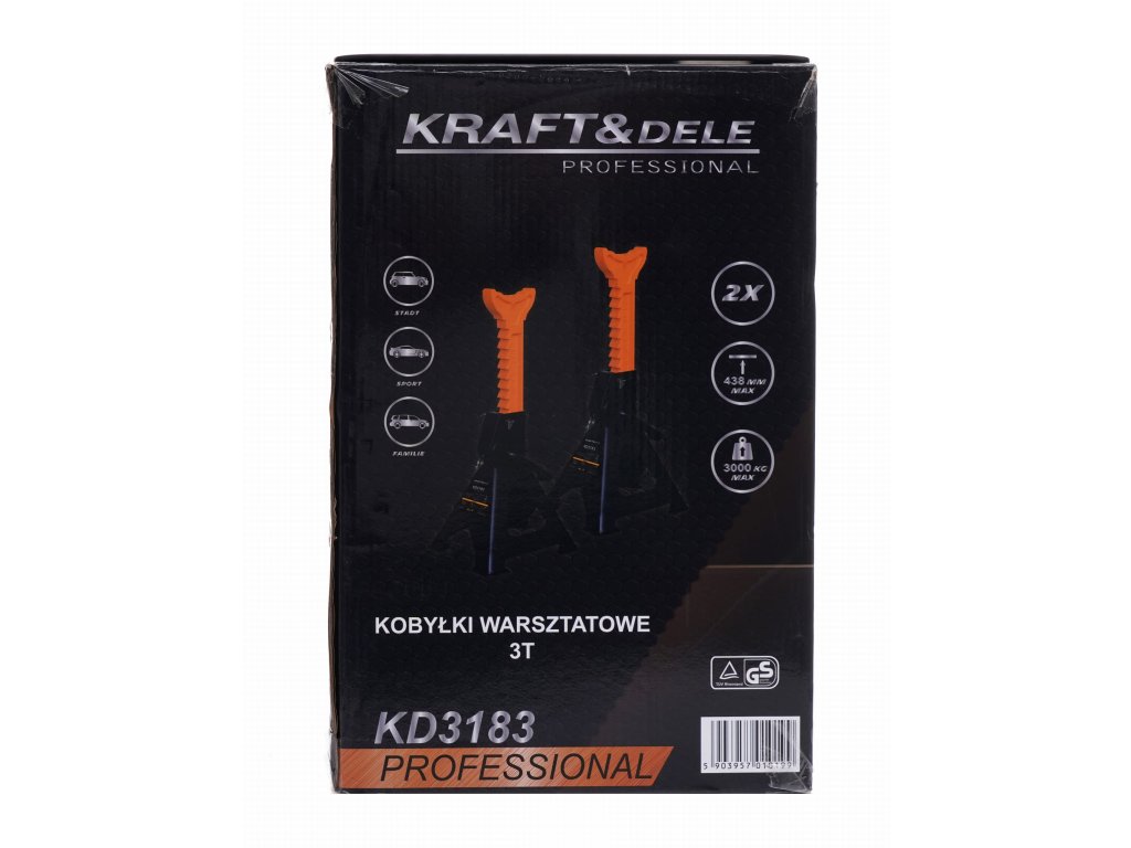 Auto podpěry značky Kraft&Dele, model KD3183 s maximální nosností 3 t. Jsou vyrobeny z kvalitní oceli odolné vůči mechanickému poškození, ohýbání i působení chemie používané v dílnách.