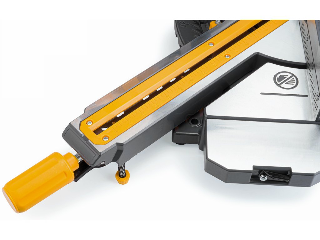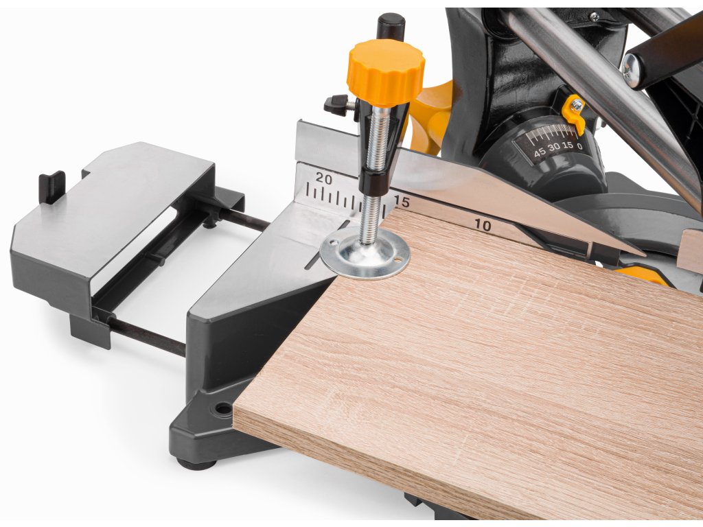 Regulovatelný vertikální svorník efektivně zajišťuje upevnění materiálu, což zabraňuje jeho pohybu během řezání. Zařízení má dvě montážní místa pro flexibilní umístění svorníku z levé nebo pravé strany.