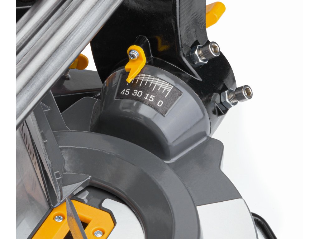 Zařízení je vybaveno otočným stolem s nastavením úhlu a naklápěcími funkcemi 0 - 45°, spolu s vodítkem a svěrákem pro bezpečné a čisté zpracování dřeva.