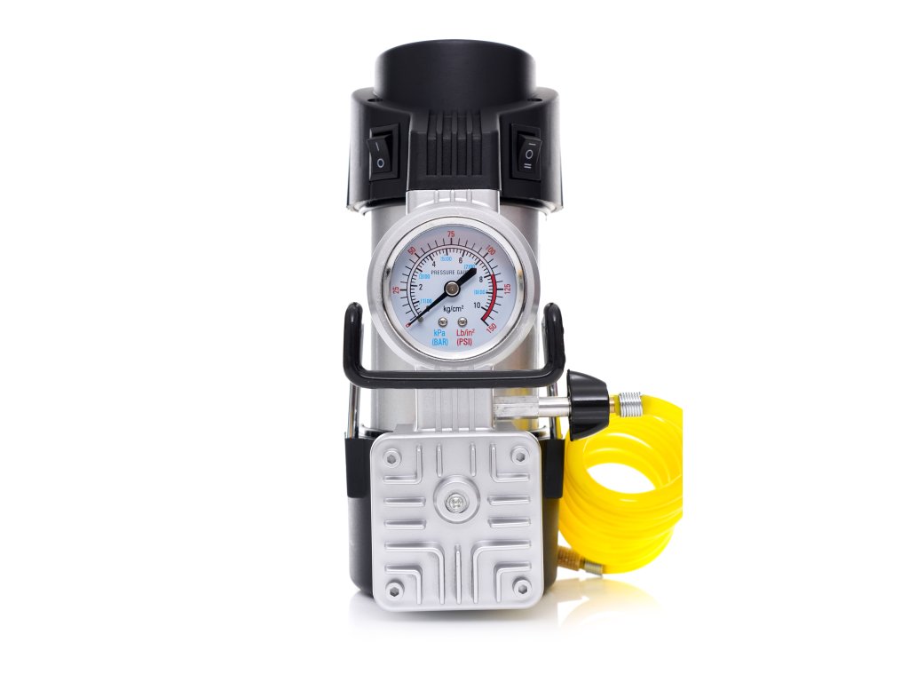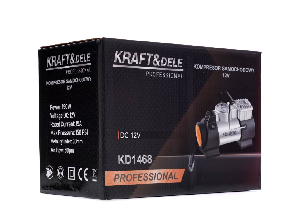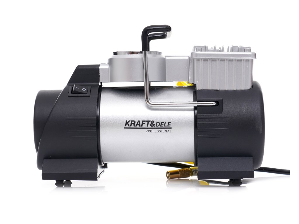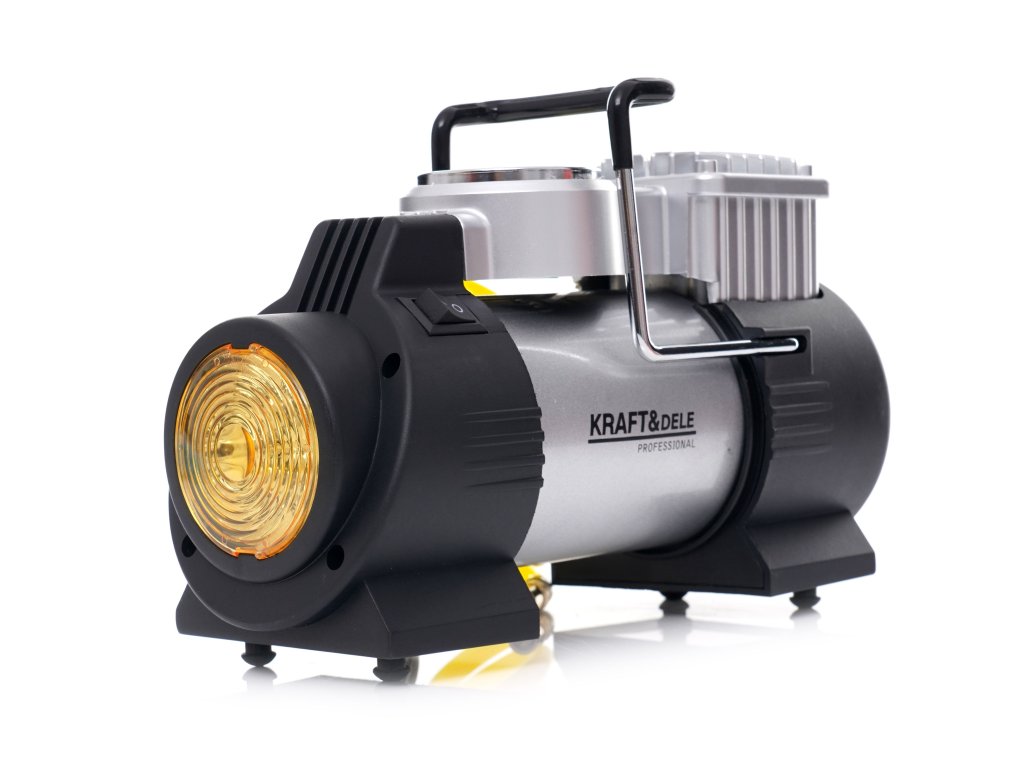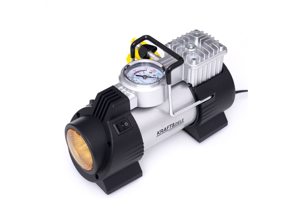 Přenosný auto kompresor / vzduchový kompresor 12V / 15A značky Kraft&Dele model KD1468 napájený z autozásuvky. Široké využití – s třemi koncovkami nafoukáte kola, míče, bazény, matrace a další.